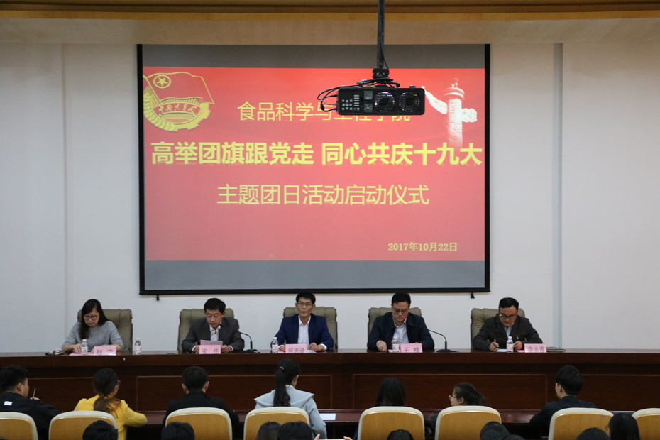 “高举党旗跟党走,同心共庆十九大”主题团日活动启动仪式。tyc234cc 太阳成集团团委书记王峰、学院党委书记何忠诚、党委副书记宋伟、团委书记李永青、正科级辅导员赵莹