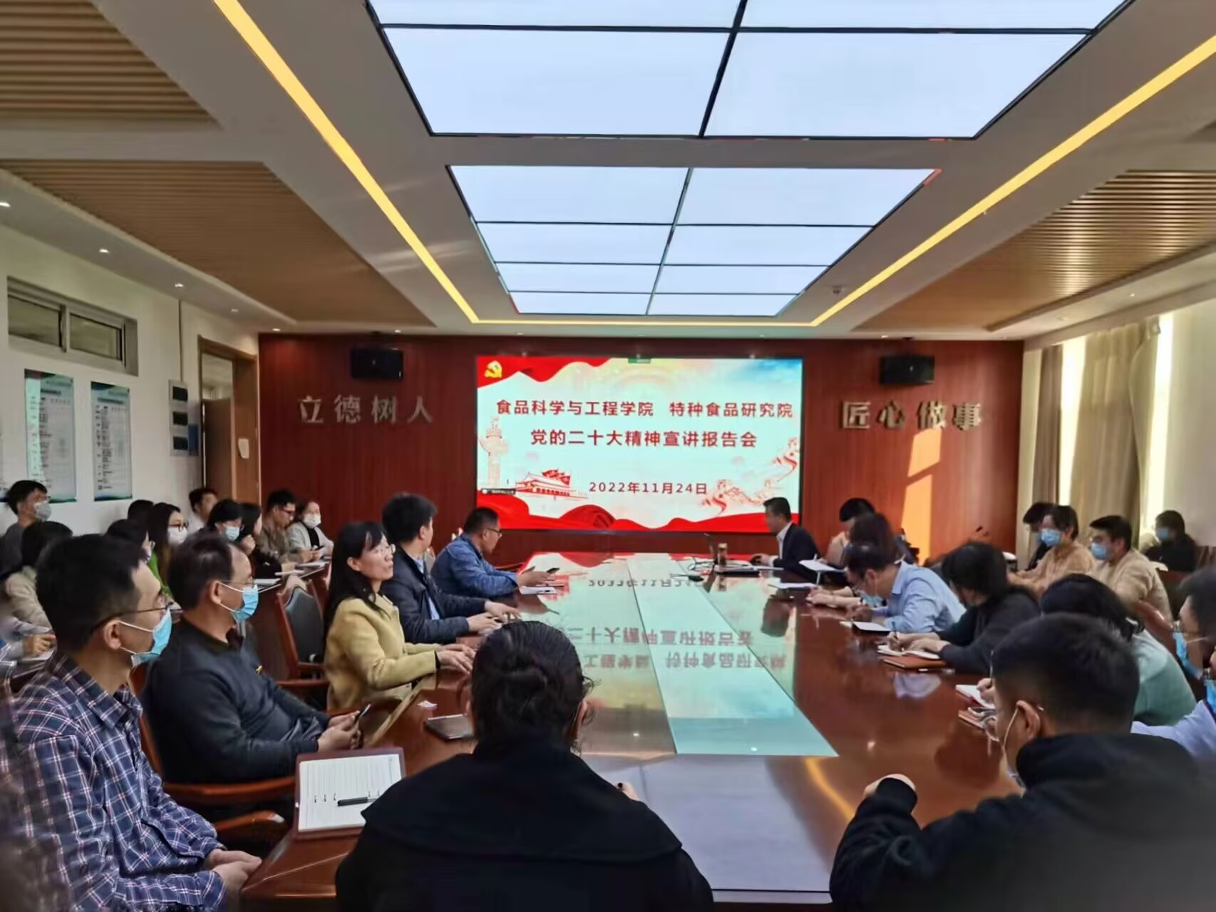 为深入学习贯彻党的二十大精神,11月24日,tyc234cc 太阳成集团、特种食品研究院在食品楼会议室召开党的二十大精神宣讲报告会,学院党委书记车广杰作宣讲报告,全体教职工、学生党员发展对象参加报告会。
