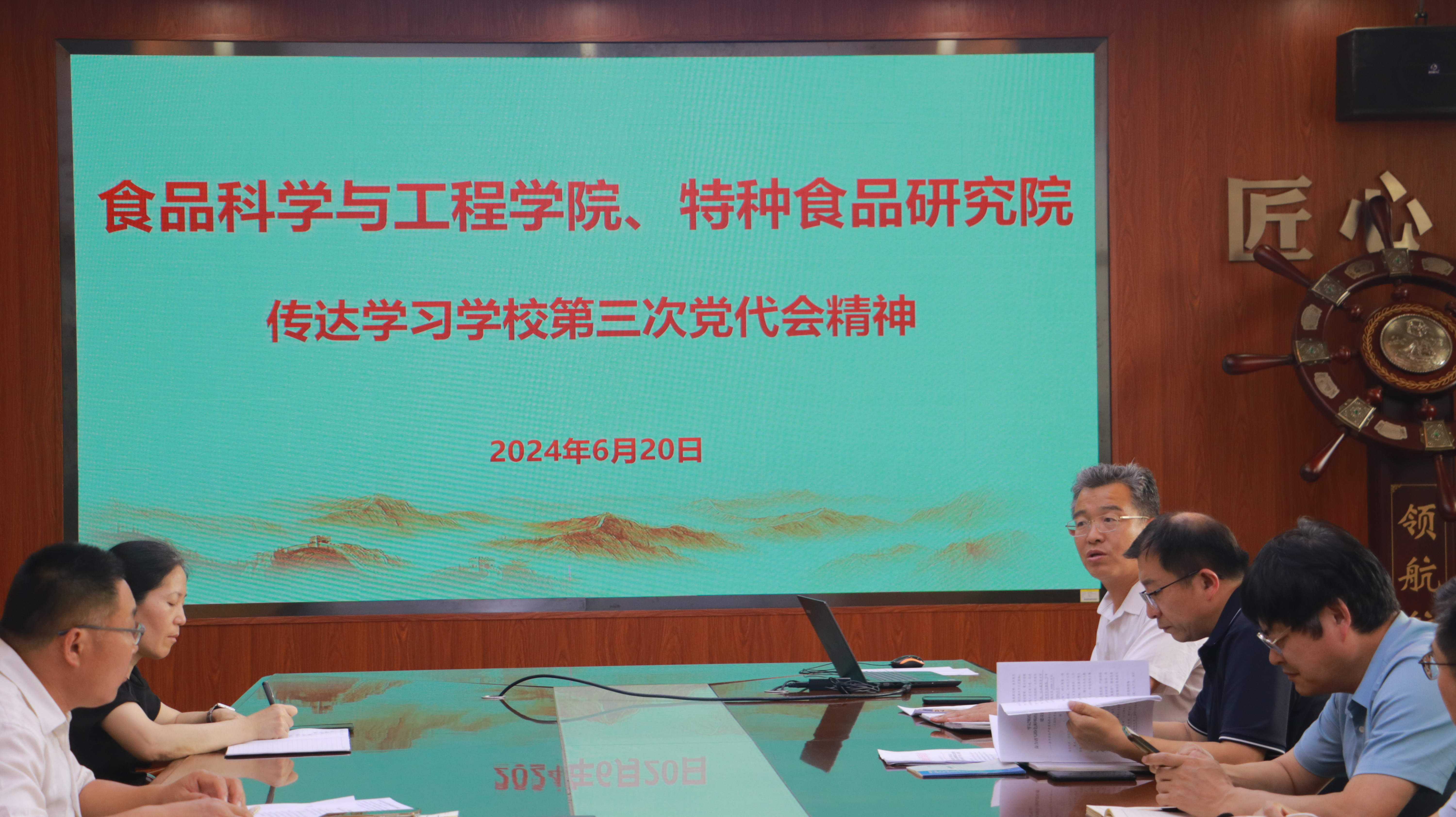 6月20日,tyc234cc 太阳成集团、特种食品研究院在食品楼310召开教职工政治理论学习会议,传达学习学校第三次党代会精神,会议由学院党委书记车广杰主持。