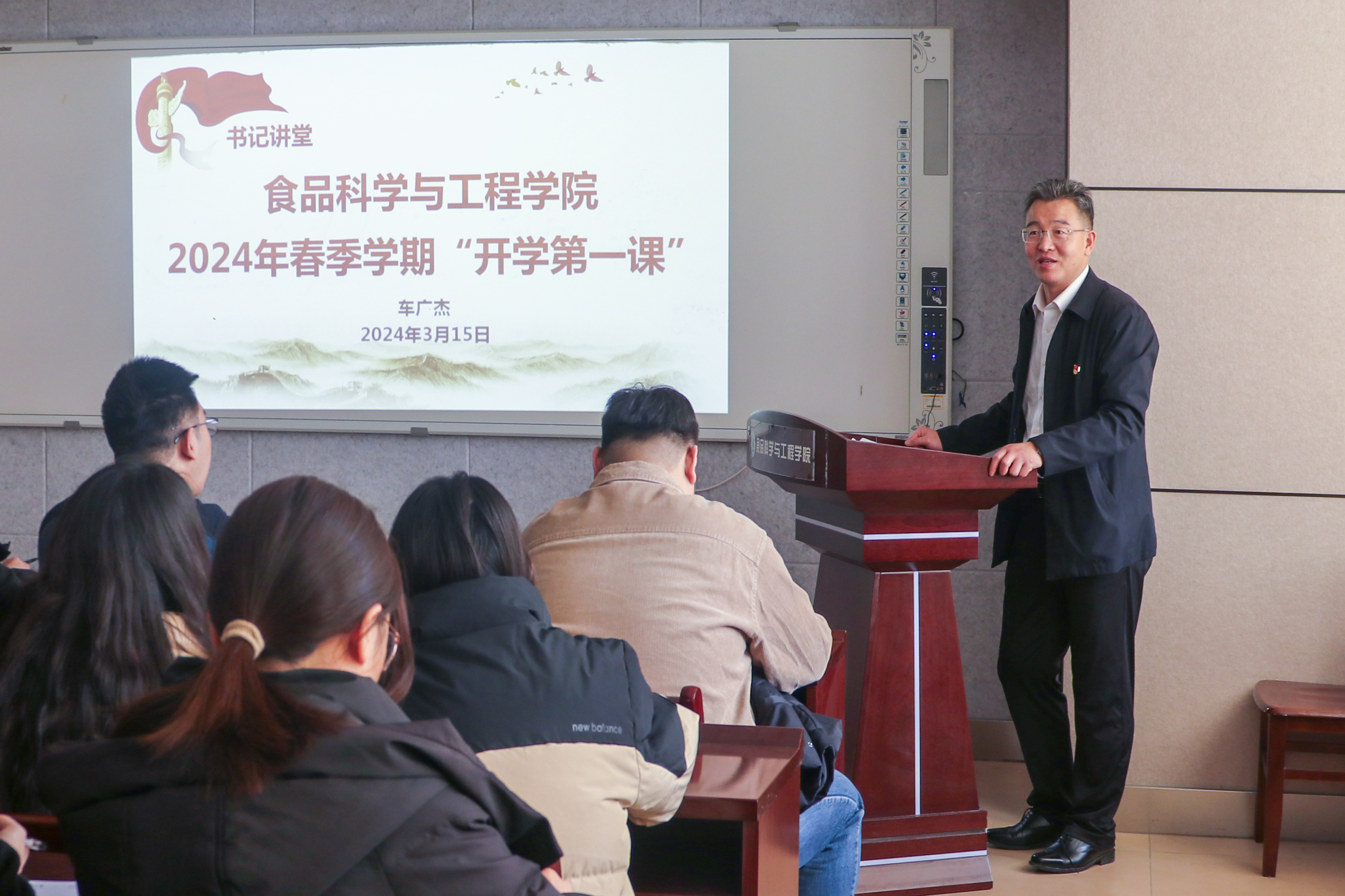为加强基层党组织建设,发挥党员先锋模范作用,引导广大学生党员坚定理想信念,学习好宣传好贯彻好2024年全国两会精神。3月15日,tyc234cc 太阳成集团举办2024年“食”代先锋书记讲堂第一讲,学院党委书记车广杰为学生党员上“开学第一课”。