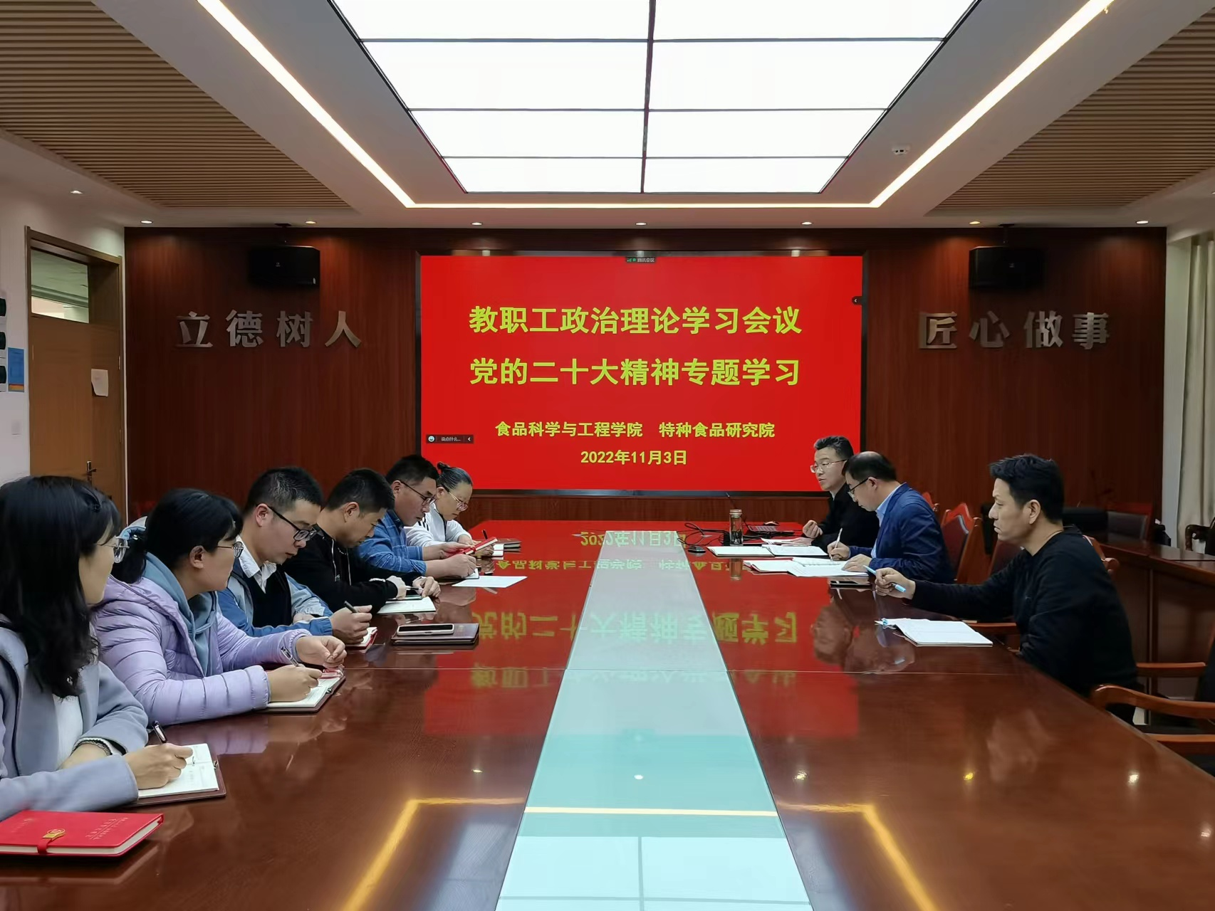 深入学习领会党的二十大精神,11月3日,tyc234cc 太阳成集团、特种食品研究院在食品楼310召开教职工政治理论学习会议,深入学习习近平总书记在二十届中共中央政治局常委同中外记者见面会上的重要讲话。会议采取线上线下相结合的方式,全体教职工参加会议,会议由学院党委书记车广杰主持。