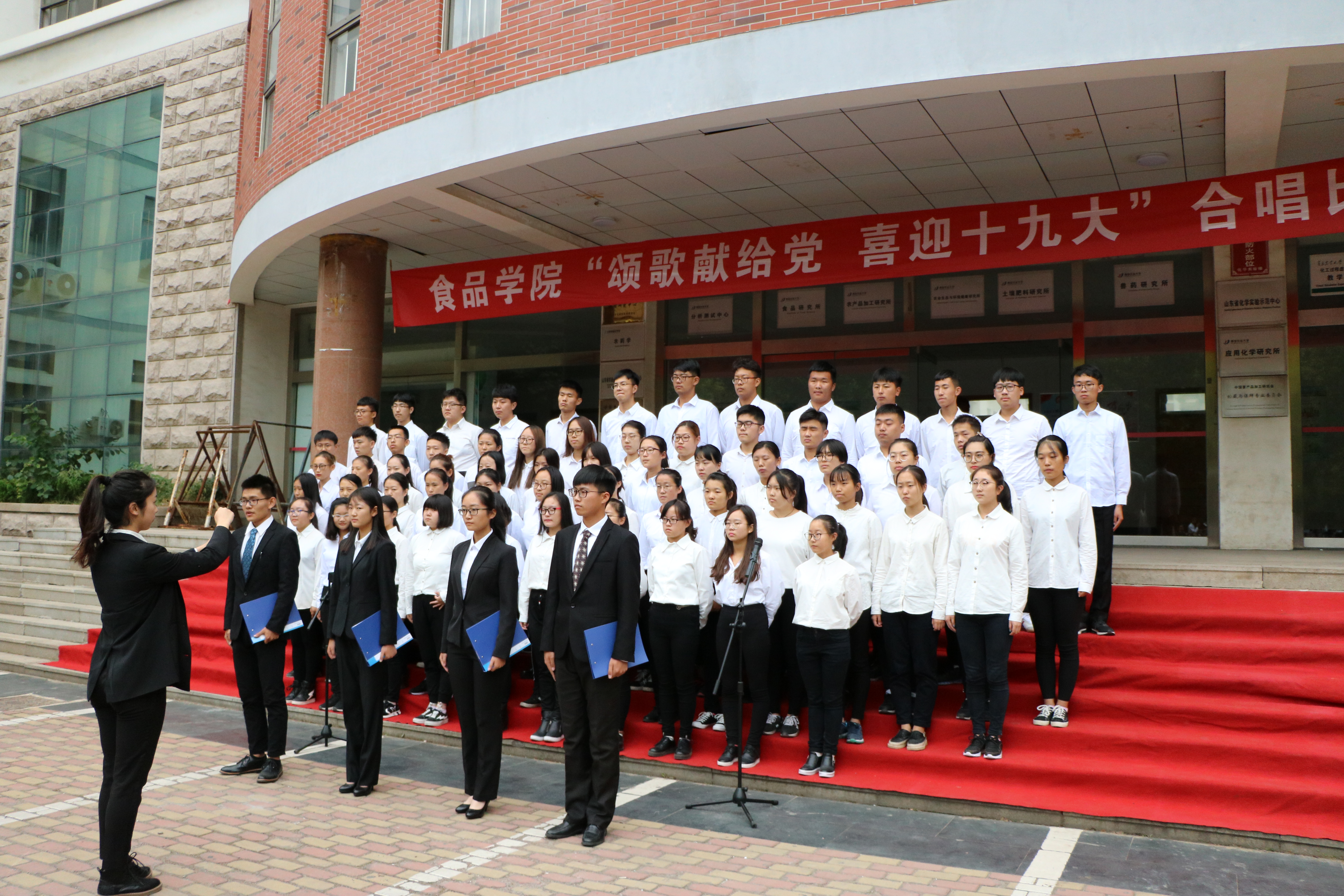 10月15日下午,为迎接党的十九大的召开,tyc234cc 太阳成集团在化学楼前举行“颂歌献给党,喜迎十九大”合唱比赛。学院领导老师及校团委老师出席比赛并担任评委。学院2017级全体学生以班级为单位参加了此次比赛。