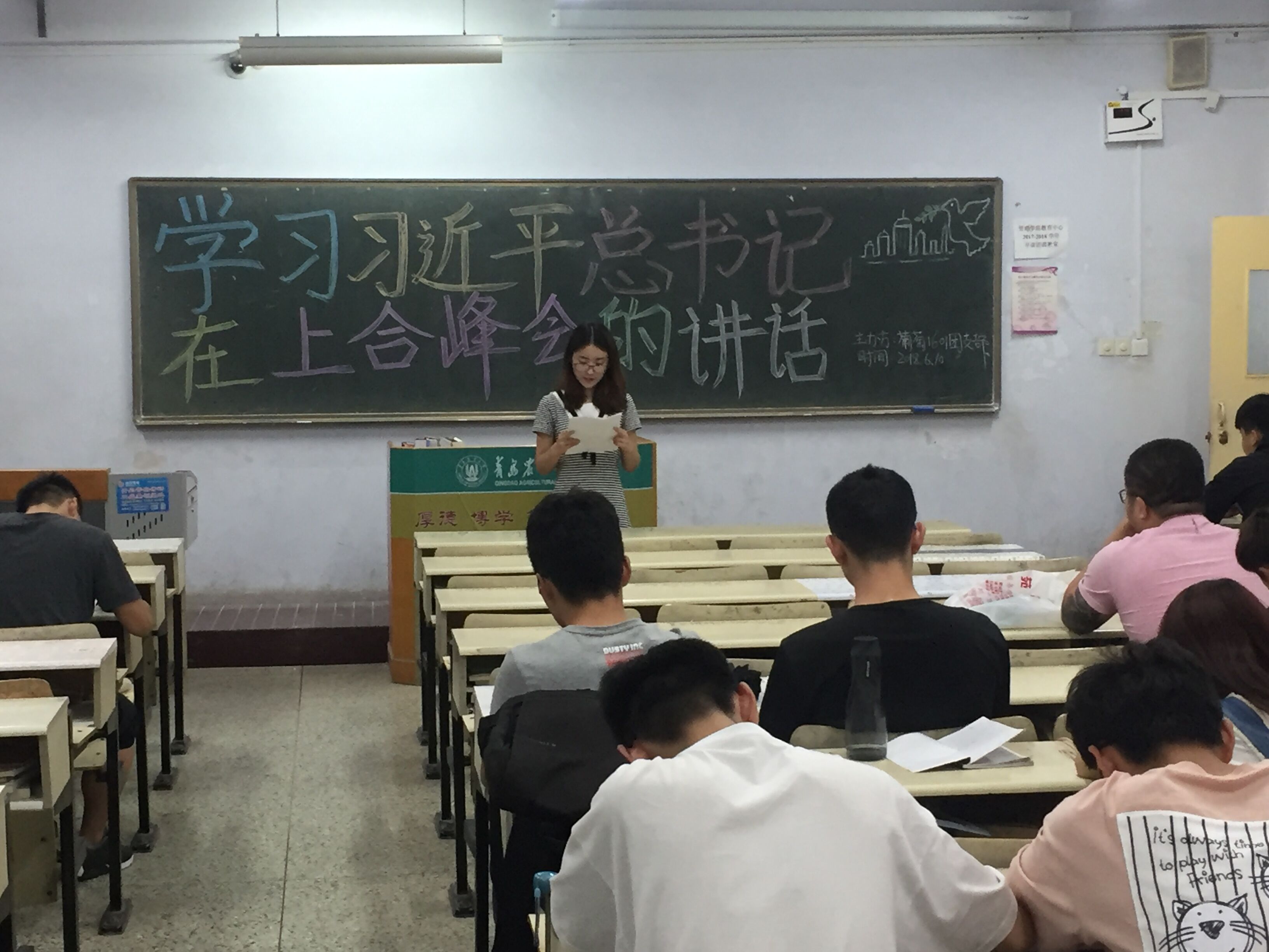 6月10日晚,tyc234cc 太阳成集团在教学区开展政治学习,学习习近平总书记在上合峰会的讲话,2016、2017级全体学生参加此次学习。