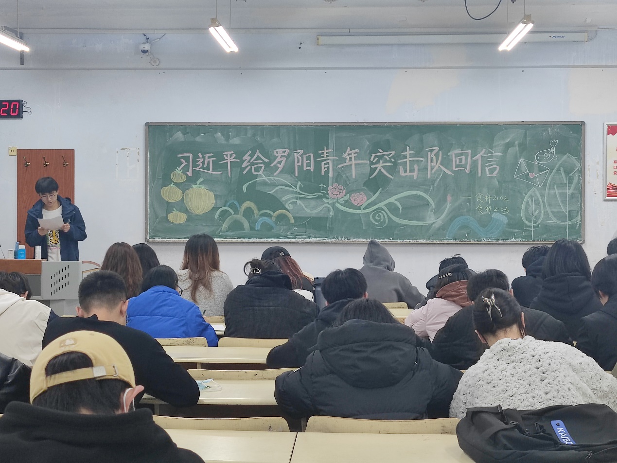 本次团课以习近平总书记给中国航空工业集团沈飞“罗阳青年突击队”队员们的回信为主要内容,深入学习矢志不渝的航空报国精神、忠诚奉献铸就大国重器的奋斗精神。各班主讲人带领大家深刻领悟了习近平总书记对青年勇挑重担、冲锋在前,将党的二十大描绘的宏伟蓝图变成现实的殷切期望。食科2102班朱容震在学习交流中呼吁同学们秉承烈士遗志,立志攻坚克难,做罗阳精神的传承者和实践者,赢得了同学们的热烈掌声。大家纷纷表示要以习近平总书记重要回信精神为指引,努力将所学知识化为实践,结合二十大精神学习,以实际行动践行“请党放心、强国有我”的青春誓言。