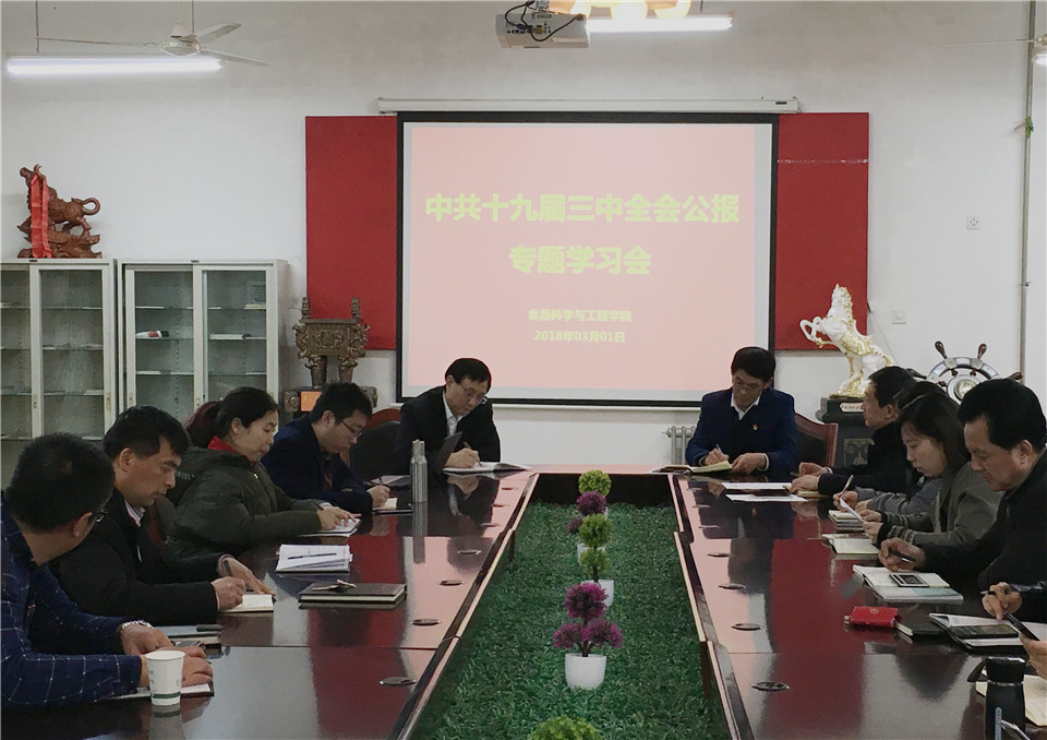 3月1日下午,tyc234cc 太阳成集团于化学楼207会议室开展《中国共产党第十九届中央委员会第三次全体会议公报》专题学习,学院师生党员参加学习。学习会由学院党委书记何忠诚主持。