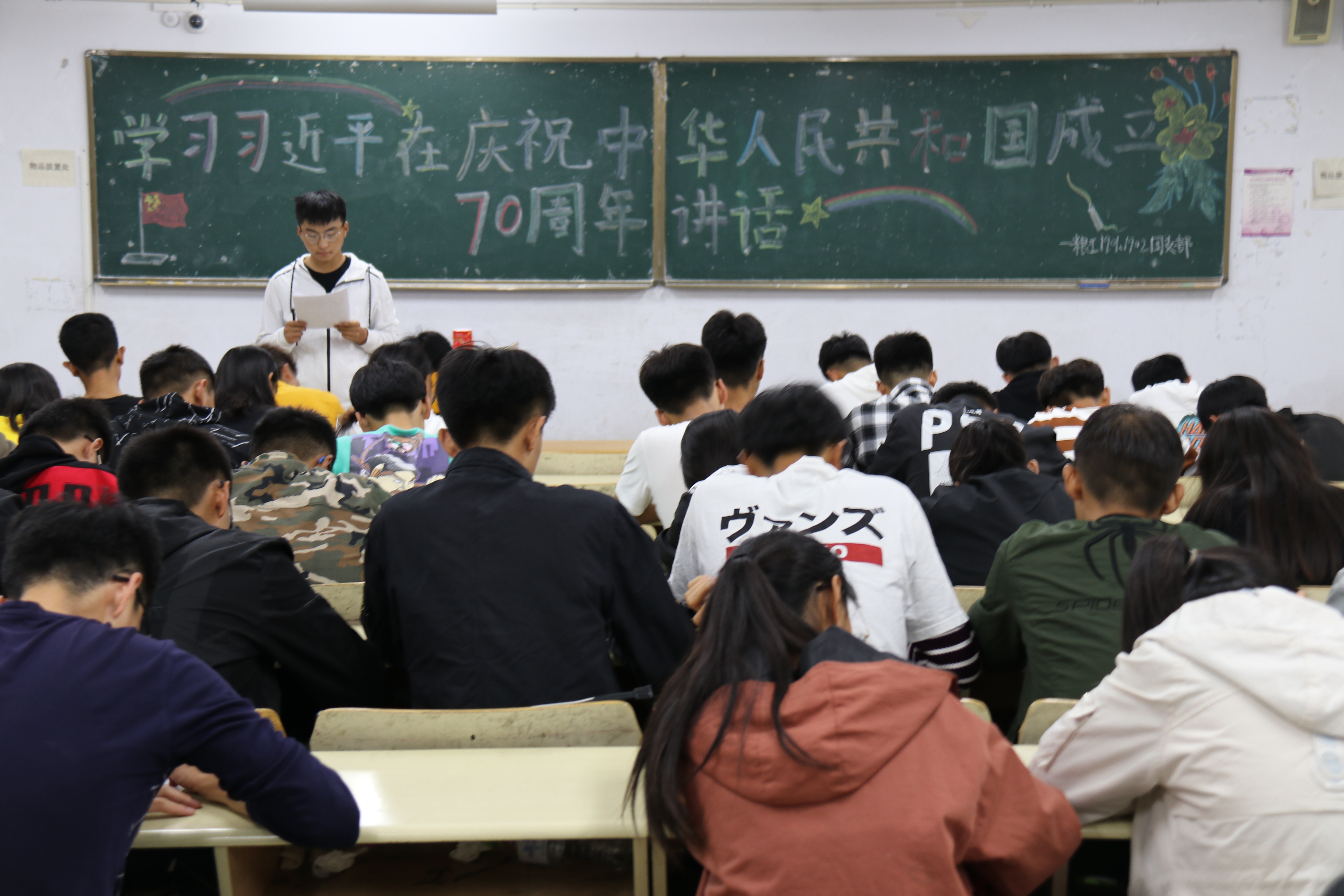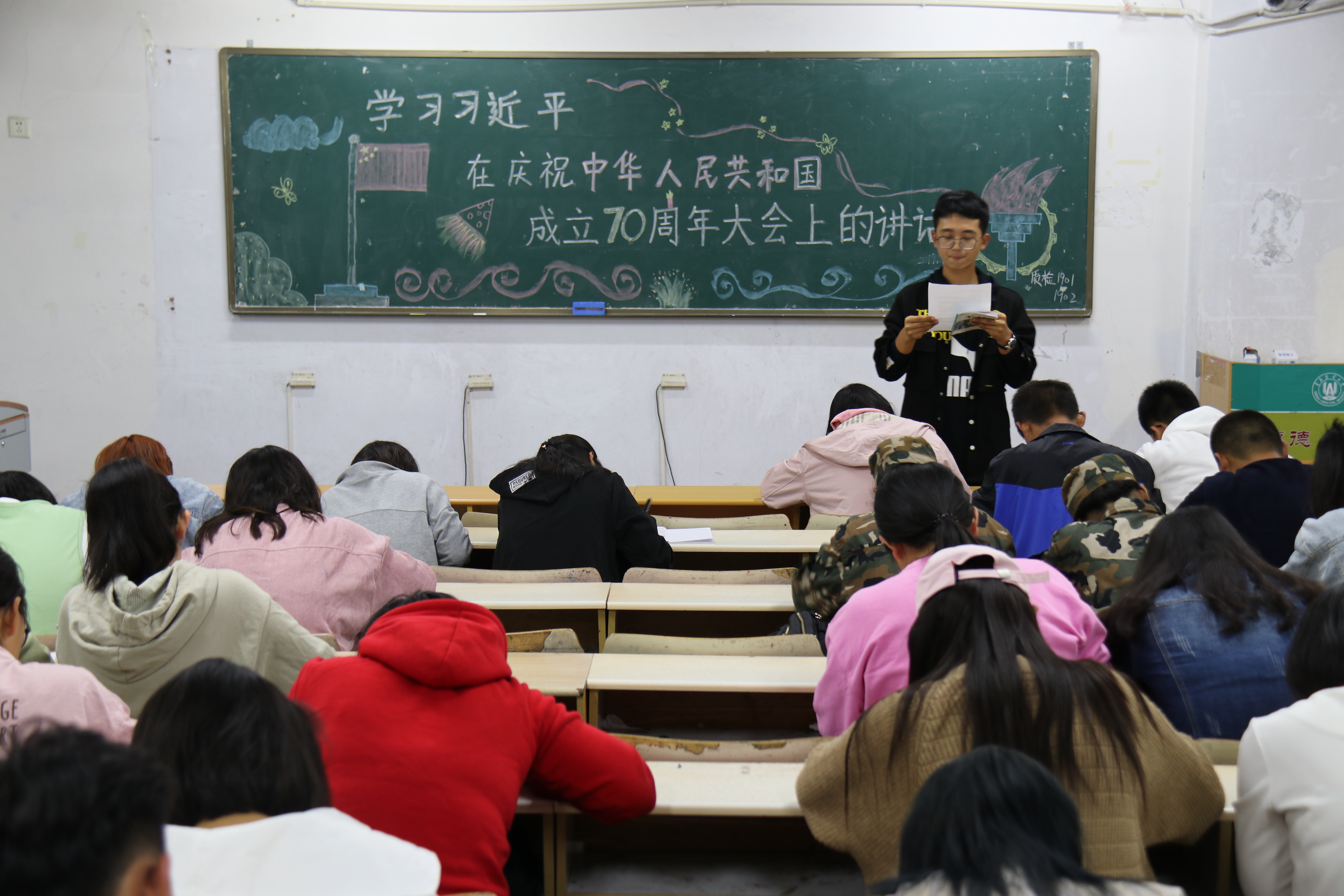 10月13日,tyc234cc 太阳成集团在教学区开展“学习习近平在庆祝中华人民共和国成立70周年大会上的讲话”主题政治学习,2018级、2019级全体学生参加。