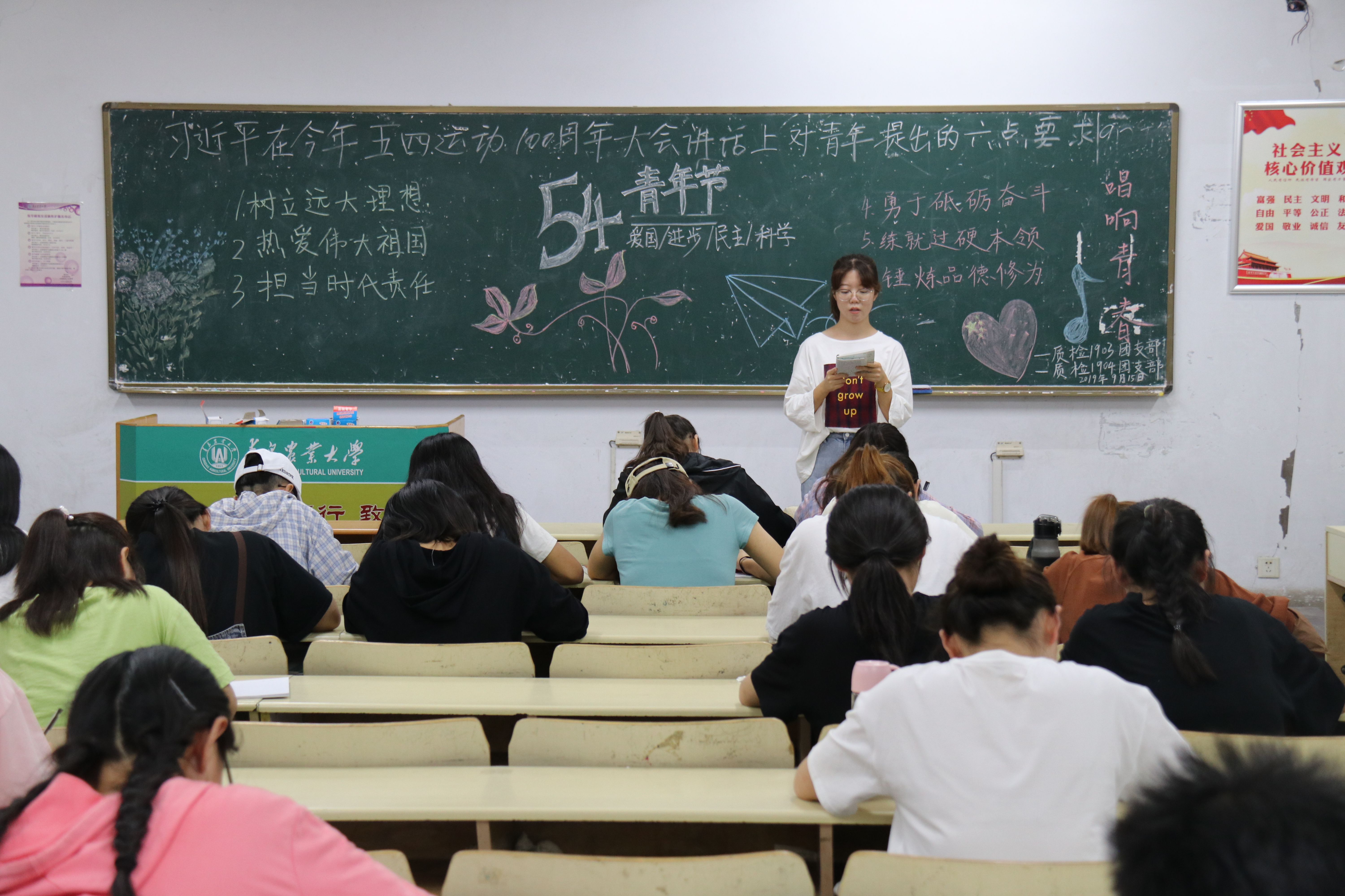 9月15日,tyc234cc 太阳成集团于教学楼开展“习近平总书记在纪念五四运动100周年大会上的讲话”主题政治学习。学院2018级、2019级全体学生参加。各班主讲人带领各班级学习习近平对新时代青年提出的六点要求:要树立远大理想、热爱伟大祖国、担当时代责任、勇于砥砺奋斗、练就过硬本领、锤炼品德修为。食科1803班郝琪臣讲到,五四运动高举起爱国主义伟大旗帜,激发了追求真理、追求进步的伟大觉醒,以全民族的搏击培育了永久奋斗的传统,我们时代青年要热爱祖国,坚信奋斗是青春最靓丽的景色。