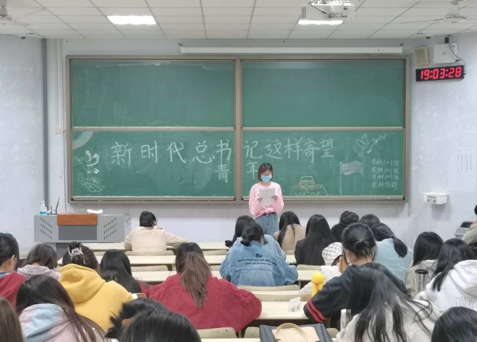 在本次政治学习过程中,各班主讲人从习近平总书记寄望青年用脚步丈量祖国大地、用眼睛发现中国精神、用耳朵倾听人民呼声、用内心感应时代脉搏四个方面为同学们详细介绍了演讲内容。习近平总处书记在演讲中指出:寄望青年,亦是寄望未来,中国人民的伟大创造精神、伟大奋斗精神、伟大团结精神、伟大梦想精神。这种伟大精神是一代一代中华儿女创造和积淀出来的,也需要一代一代传承下去。食科2102班主讲人姜少杰呼吁大家:新时代是追梦者的时代,青年是与新时代同向同行、共同前进的一代,作为青年人应牢记党的教诲,不负韶华,不负时代,在青春的赛道上奋力奔跑,争取跑出当代青年最好的成绩。