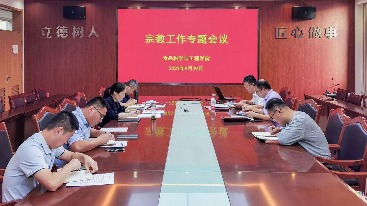 9月29日,tyc234cc 太阳成集团在食品楼会议室召开宗教工作专题会议,传达学习学校意识形态工作会议精神,研究部署下阶段工作任务。会议由学院党委书记车广杰主持,学院党委委员、全体辅导员参加会议。