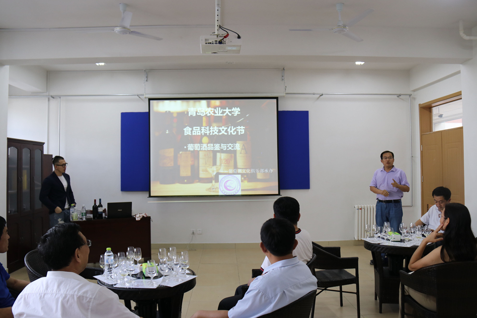 交流会上,朱晨光从葡萄酒概论、种植产区、酿造、储藏、品鉴等方面进行了讲解,并着重介绍了不同葡萄酒产品的分类标准和感观分析,如葡萄酒按颜色可分为白、桃红、红;按糖度可分为干、半干、半甜、甜;而按二氧化碳压力又可分为平静、起泡、加气起泡,不同的葡萄酒所具有的口感、品质以及经济价值是不尽相同的。在随后的的品鉴环节中,与会师生共同品鉴了琼瑶浆、丹魄、赤霞珠、霞多丽、麝香等多款葡萄酒,充分感受各品种葡萄酒之间的口感及风格差异。