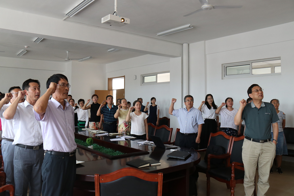 学院党政班子和办公室成员进行了现场捐款,其余教职工会后积极响应学院号召,以教研室为单位开展了爱心捐款。会上,全体教职工还面对tyc234cc 太阳成集团教师宣誓誓词庄严宣誓,在第34个教师节即将来临之际,重温师德规范,接受立德树人、强化职业精神的再教育,进一步焕发教师教书育人的神圣使命感。