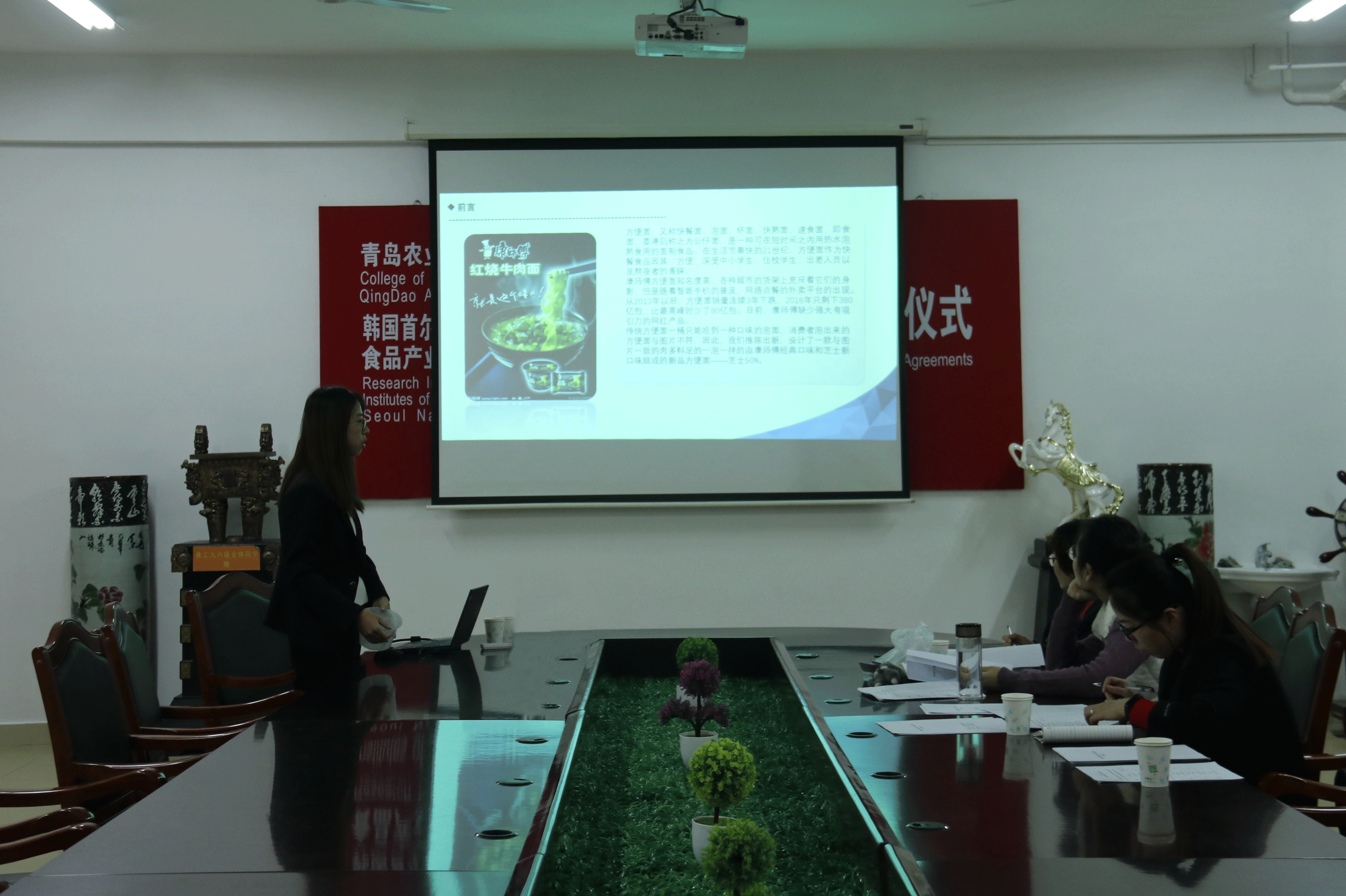 此次比赛以方便面为主要产品,从食用方法、面饼改良和面桶创新等方面进行实践创新。活动开始,参赛选手着装整齐,秉承创新性、实用性的原则,上台讲解自己团队创新产品并就传统方便面的利弊进行深入分析,突出各自团队创新型方便面的优点。其中,红红泡面队的康师傅红烧牛肉网红面令人眼前一亮。它在采用红烧牛肉面的基础上加入了50%的芝士泡面,考虑到中国人口味的同时富有西式芝士的香醇。除此之外,红红泡面队对泡面容器的创新也别具一格,康师傅网红面的面桶由为内桶和外桶两部分组成 内桶一共两套,一套布满小孔,泡面泡好之后提起内桶,将外桶的水倒掉后放回内桶,加入辣椒包即可成为拌面。另一套内桶中间设置隔板 将其一分为二,加入不同的料包,便可同时享受两种美味。最后,老师们分别对各团队的创新产品进行了指导与点评,并评选出红红泡面队与超强火鸡队作为优胜团队进入决赛。