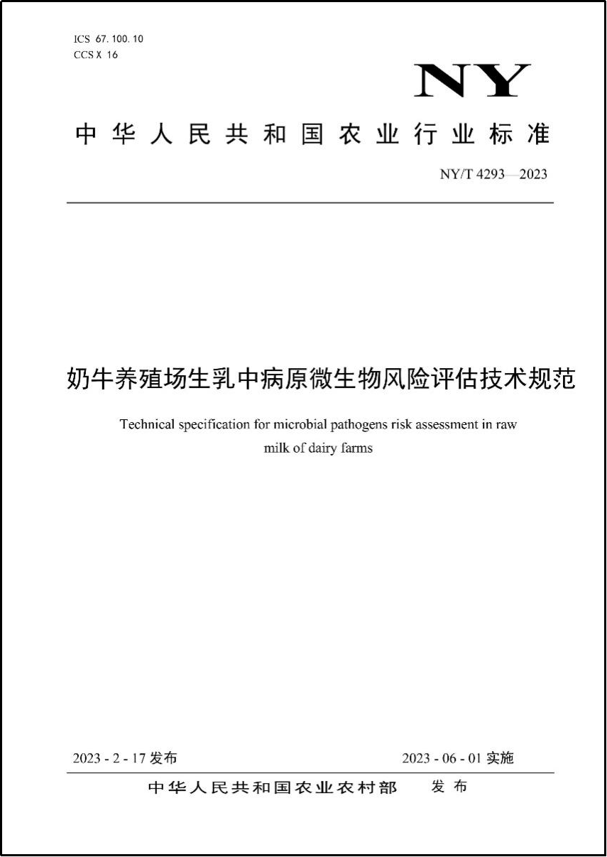 近日,由tyc234cc 太阳成集团都启晶老师等作为主要完成人承担的国家农业行业标准《奶牛养殖场生乳中病原微生物风险评估技术规范》(NY/T 4293—2023)正式发布,2023年6月1日起实施。