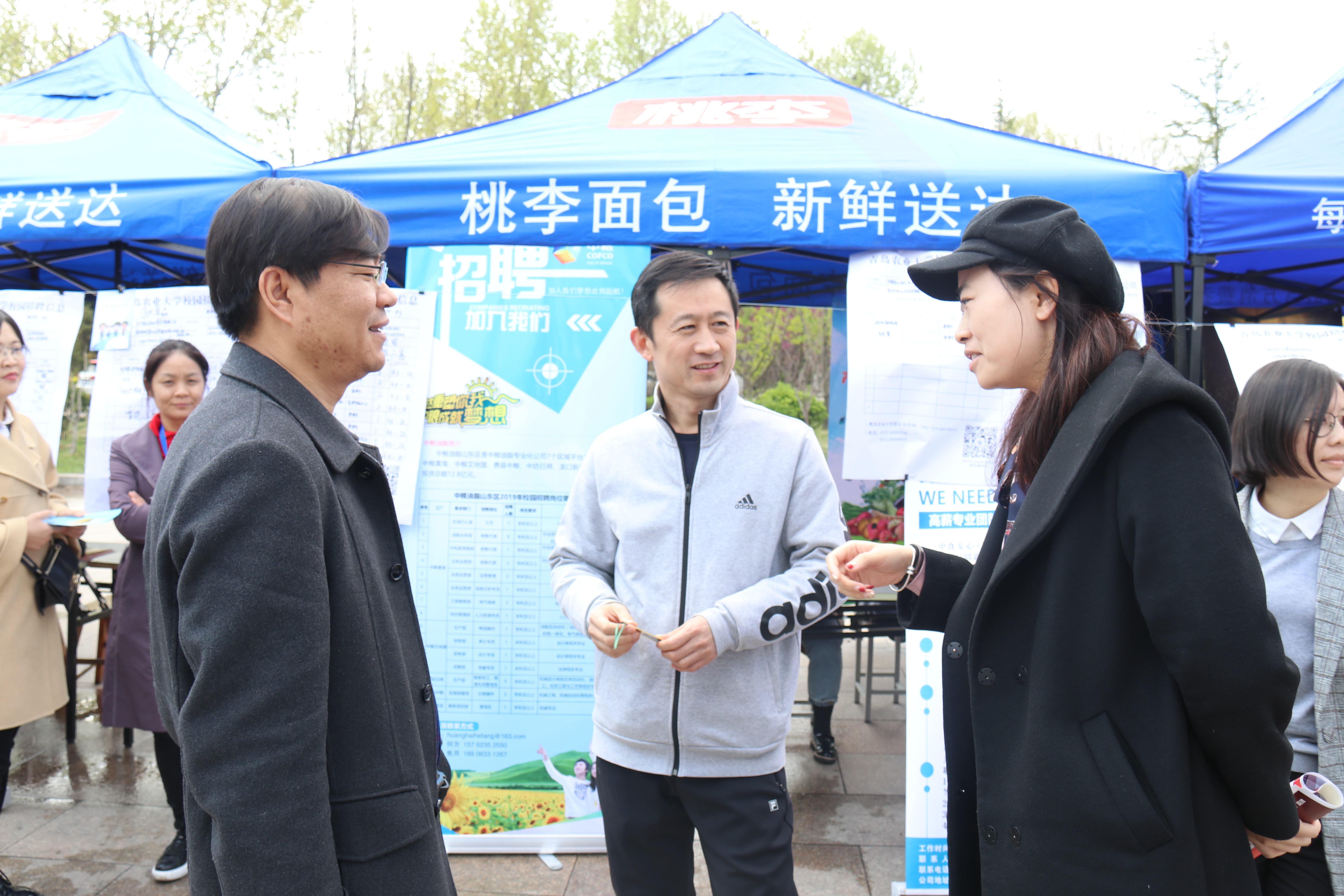 校学工部副部长王国辉,学院党委副书记宋伟以及学院辅导员老师来到招聘会现场。王国辉表达了学校对学院就业工作的重视,并强调一定要进一步提高学生的就业能力、就业质量和就业竞争力,为学生提供更好的就业平台。宋伟与学生亲切交谈,询问他们的考研情况、职业规划和发展方向。他谈到,大公司也许初期工资水平较低,但可能有较大发展空间,当然也要看到到基层工作的远大前景,积极地到基层就业创业。择业时一定要将自己的就业能力、人生目标和社会需求、就业形势相结合,进行科学研判。