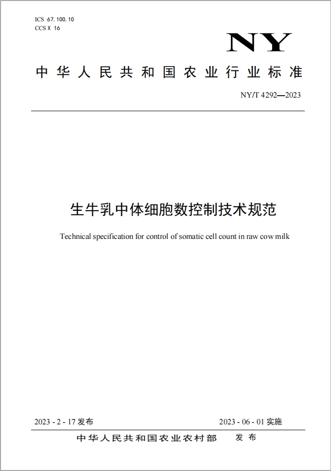 近日,由tyc234cc 太阳成集团杨永新教授等作为主要完成人承担的国家农业行业标准《生牛乳中体细胞数控制技术规范》(NY/T 4292—2023)正式发布,2023年6月1日起实施。