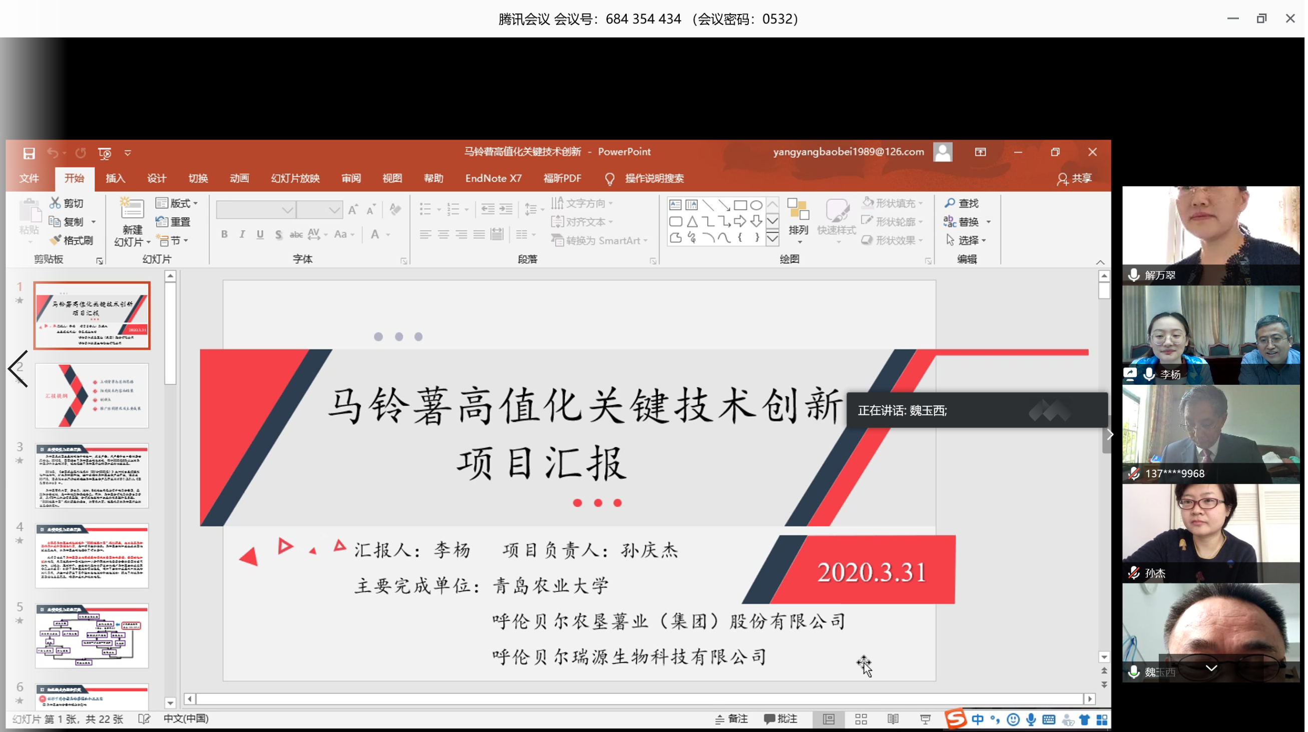 为促进马铃薯产业不断创新和发展,合理评价食品科技成果的质量和水平,加快食品科技成果的推广应用,3月31日,青岛食品科学技术学会组织相关专家对tyc234cc 太阳成集团等单位完成的“马铃薯高值化关键技术创新”成果进行了会议评价。青岛市食品科学技术学会理事长王宝维教授主持了本次科技成果评价工作。邀请中国海洋大学林洪教授、青岛大学魏玉西教授、青岛科技大学解万翠教授、中国科学院青岛生物能源与过程研究所李朝旭研究员以及山东省农科院花生研究所孙杰研究员等5位专家组成评价专家组。
