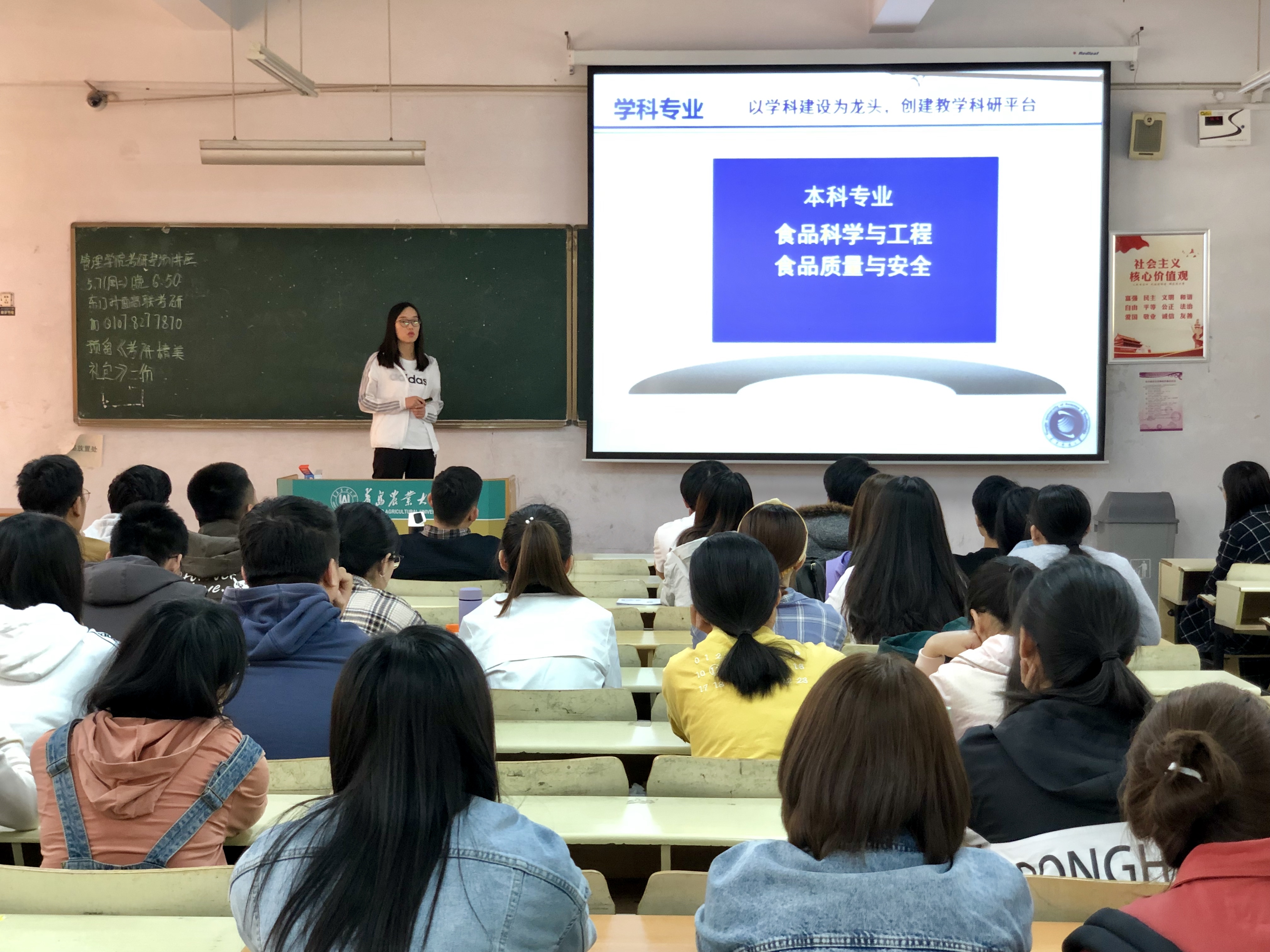 会上,杜婷首先对我院本科教育工作表示高度赞赏,近几年,我院学生在研究生入学考试中,被天津科技大学录取的人数较多,学生入学后的专业基础扎实、科研水平突出,赢得了天津科技大学广大教师的良好口碑。随后,杜婷从太阳概况、学科专业、师资队伍、教学科研方面简单介绍了天津科技大学食品工程与生物技术学院。天津科技大学食品工程与生物技术学院现设有食品科学与工程一级学科博士后科研流动站等多个流动站,食品科学与工程一级学科硕士点等多个硕士点,拥有一个食品营养与安全国家重点实验室。杜婷还与现场学生亲切交流,询问他们的考研目标学校,给出相应的指导意见。她鼓励学生们与其他高校优秀学生进行交流,提前了解专业方向,为考研之路做充足的准备。