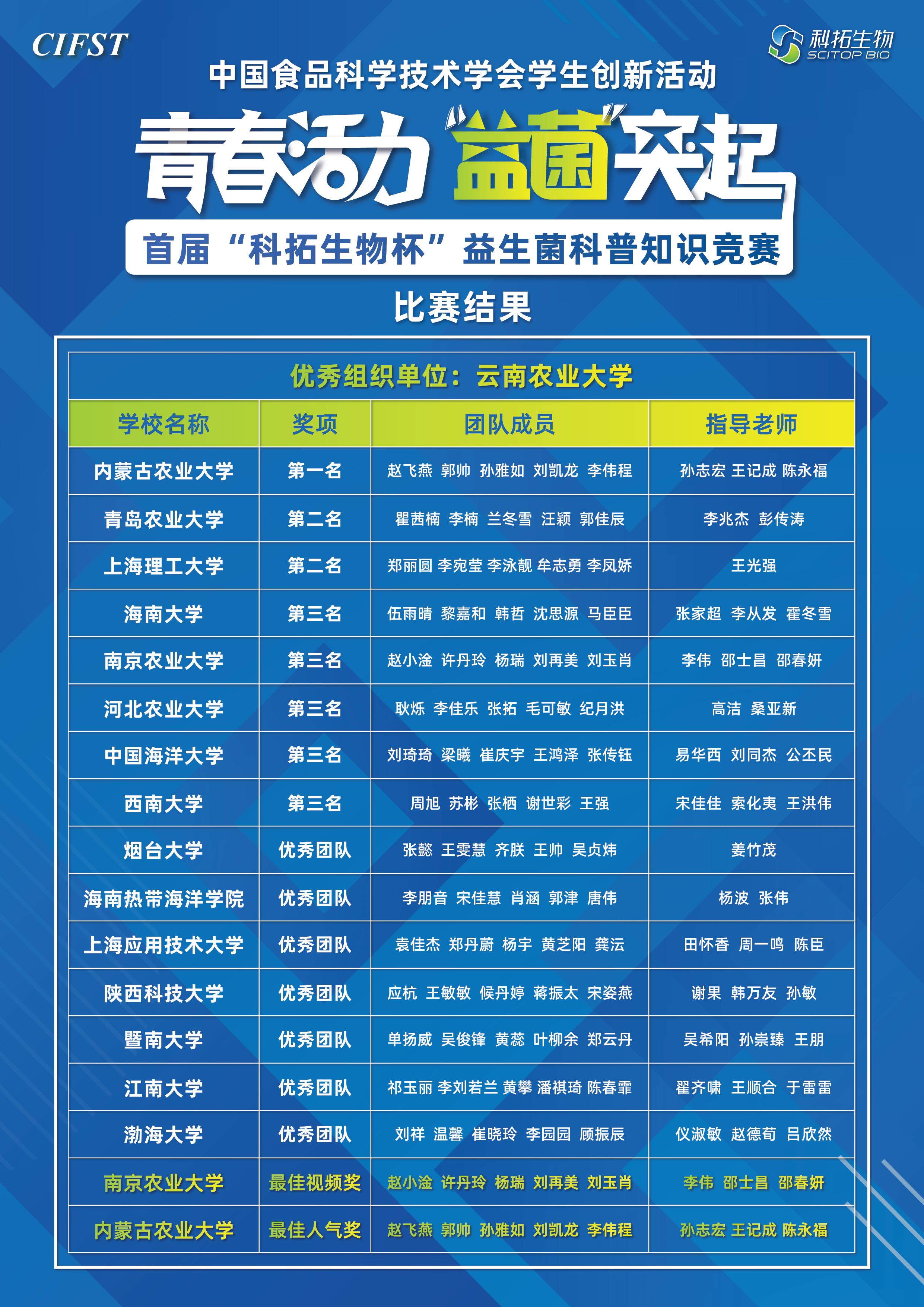 本次大赛是由中国食品科学技术学会携手北京科拓生物技术股份有限公司共同举办的大学生创新活动,竞赛面向全国高校,以“青春活力 ‘益’‘菌’突起”为主题,立足“产、学、研、用”,围绕益生菌筛选、功效评价、科学研究、生产应用等进行考核,主要考察选手在益生菌、益生菌与益生元和后生元、益生菌与肠道菌群、益生菌与人体健康、益生菌生产应用等领域的基础知识和技术能力。