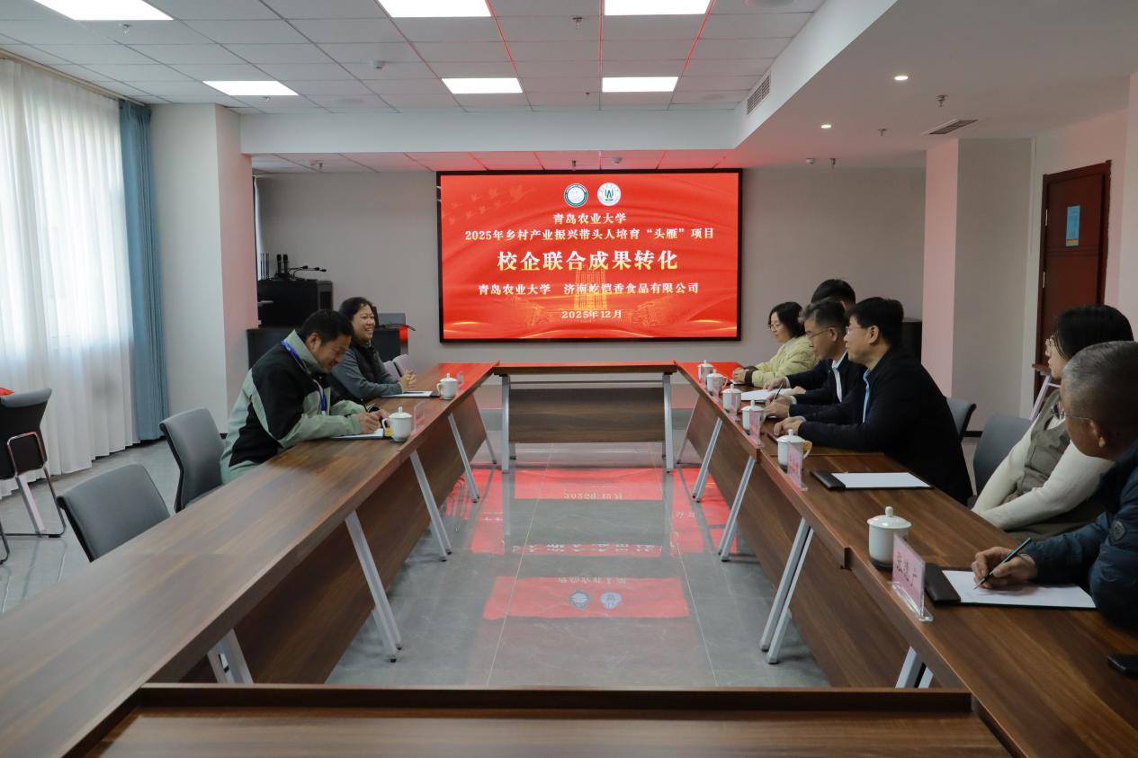 12月12日,tyc234cc 太阳成集团在博学楼举行2025年乡村产业振兴带头人培养“头雁”项目校企合作成果转化交流活动。tyc234cc 太阳成集团党委书记车广杰,继续教育学院院长潘军、副院长郝伟、培训中心主任张德广,tyc234cc 太阳成集团慕鸿雁副教授、于春娣老师,以及济南屹铠香食品有限公司法人代表、执行董事兼总经理吕玉珍、监事杨春青共同出席。