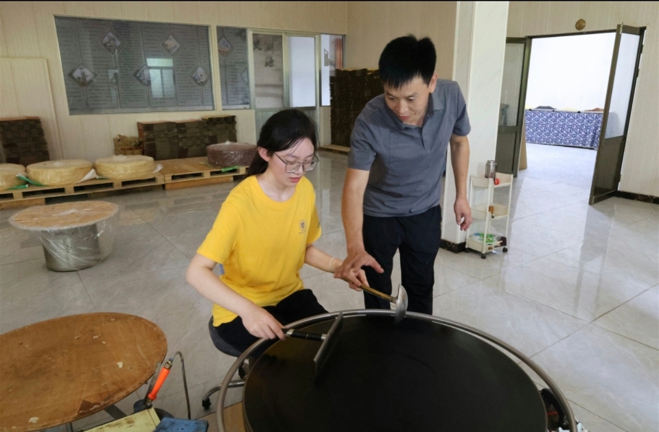 实践团来到蒙阴常路大嫂煎饼店,临沂市人大代表徐海霞详细讲解了自己如何让沂蒙煎饼从传统食品成为群众“致富花”的艰辛历程,期间,徐海霞还指导团队成员亲手制作煎饼花,众人亲身感受这一日常食物变身工艺品的独特魅力,以及当地创新赋能传统食品产业升级的特色形式。
