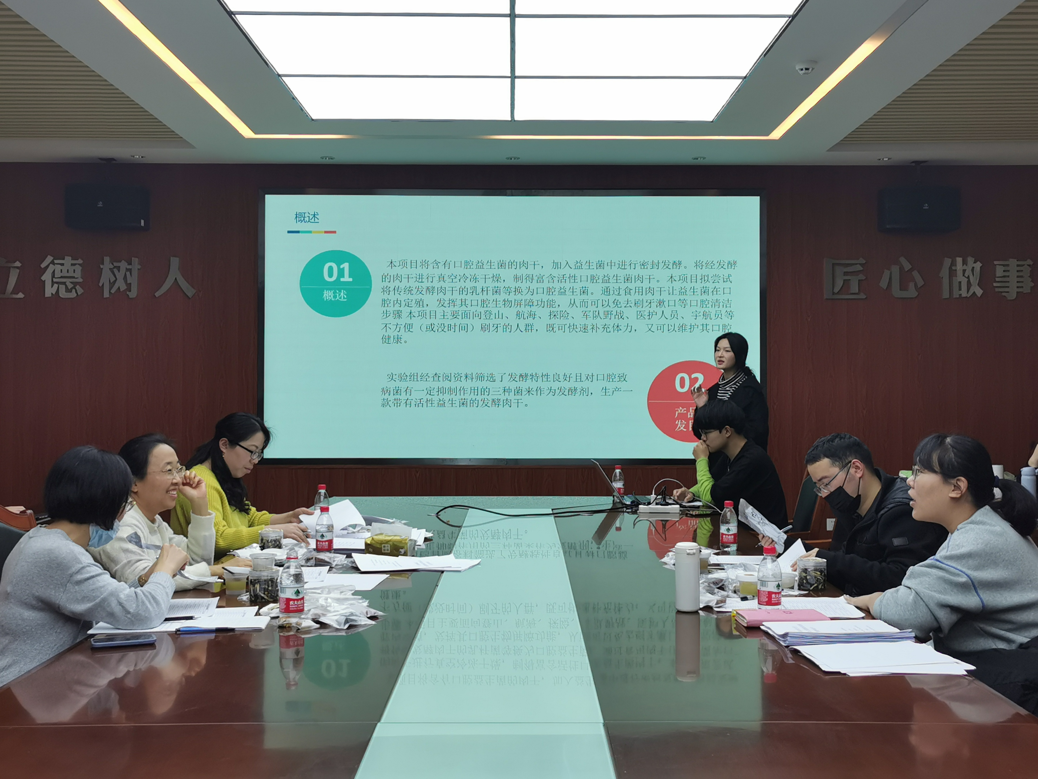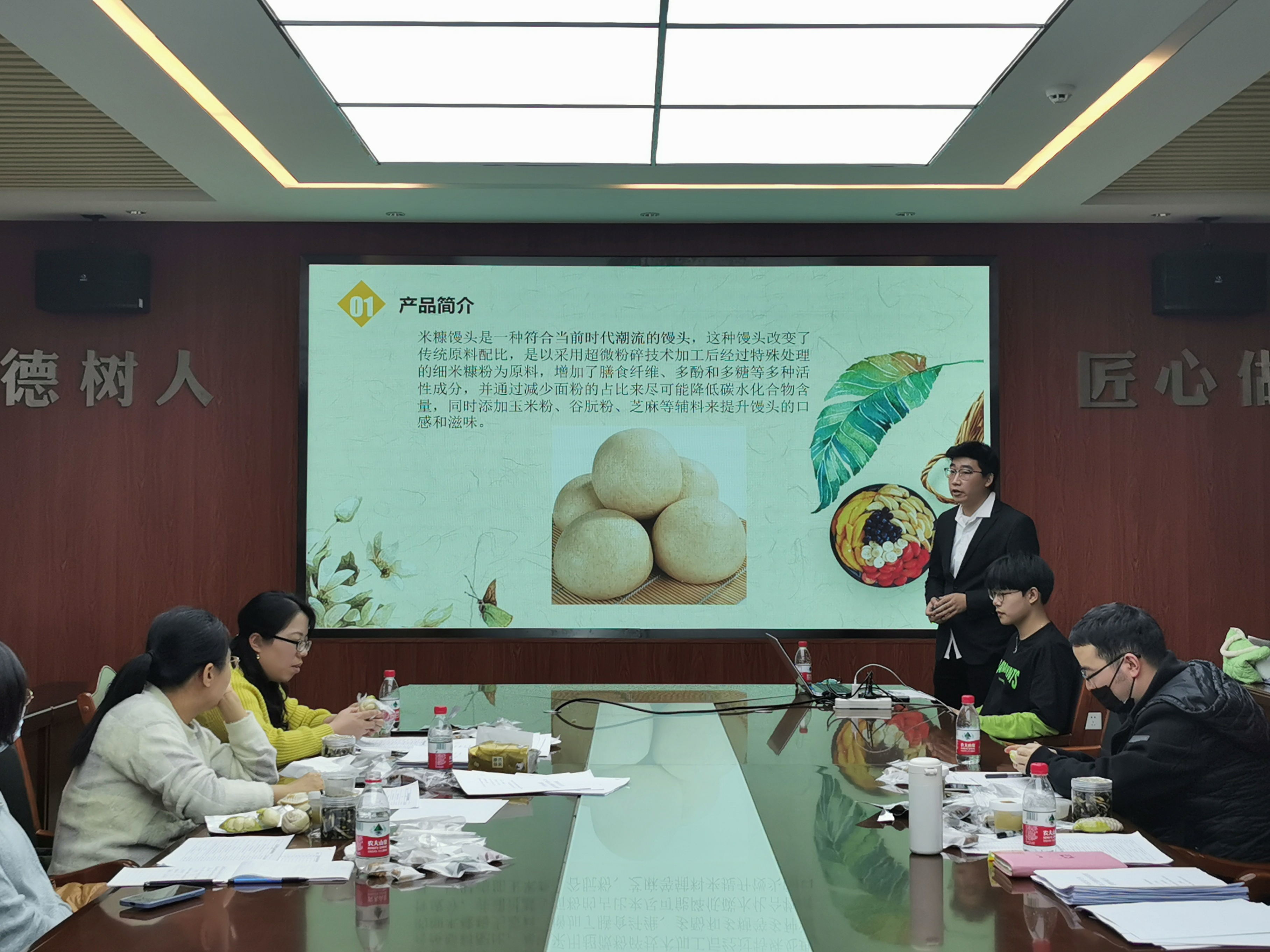 比赛分为团队PPT汇报和答辩两个环节,要求各团队参赛作品紧扣竞赛主题。各团队需在五分钟内完成PPT汇报,并接受评委教师对创新项目的提问。其中,“可食性吸管”项目团队以国家颁布的“限塑令”为背景,利用海藻提取物为原料制备出新型生物质材料吸管,具有易降解、可食用、有利于减少白色污染等优势,并通过试吃、浸泡等方式向评委老师展示了产品的可食性、耐热性。“耐热杀菌鲜湿方便米粉”项目则以籼米为原料,通过预处理、浸泡、磨粉、调浆、蒸粉、切粉等复杂的工艺流程制作出高韧性的鲜湿方便米粉,有效解决了传统干米粉保质期短、食用不便等问题,具有更大的创新性和市场效益,赢得了评委老师的一致好评。