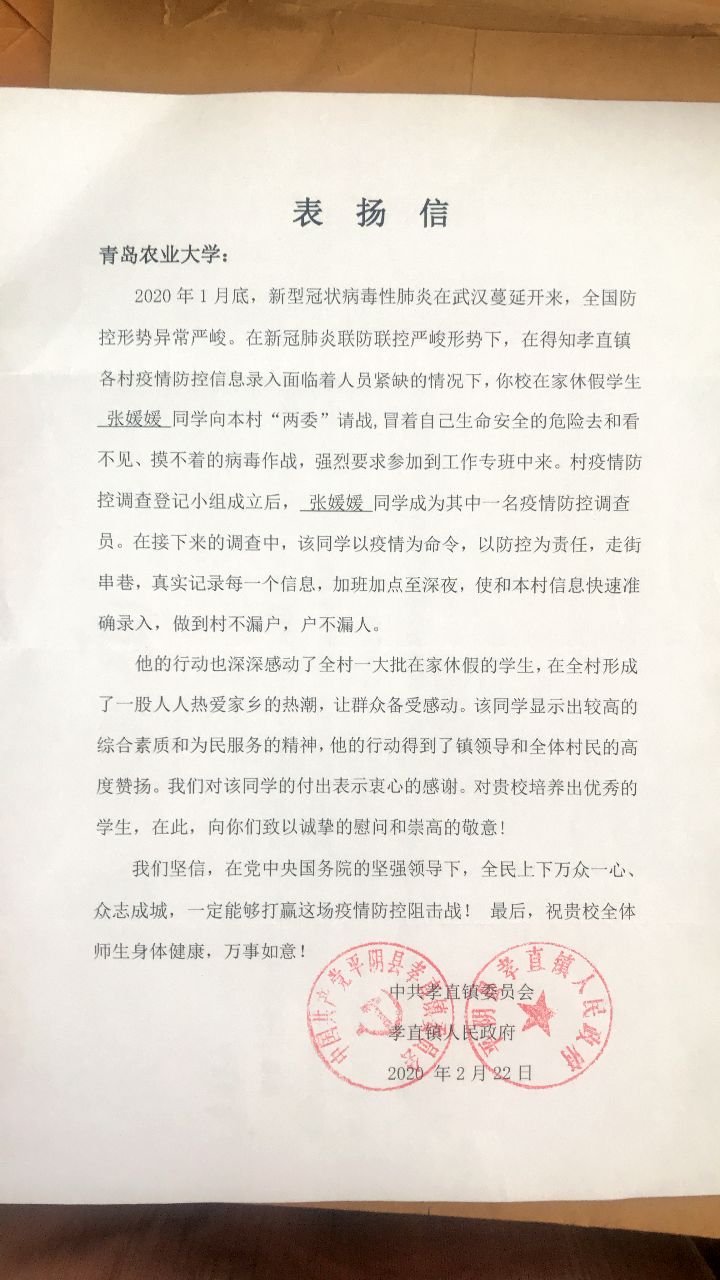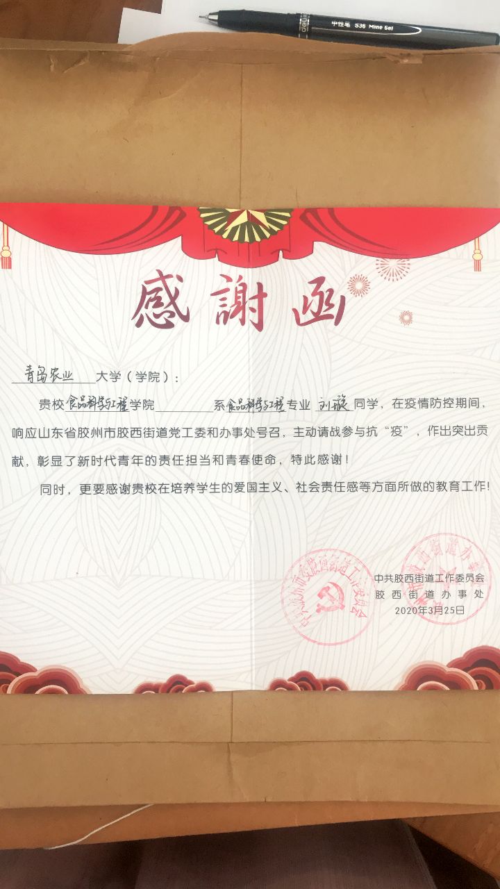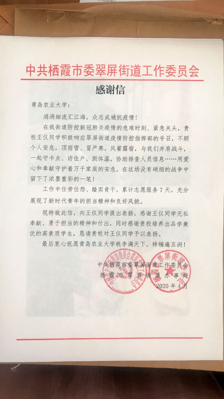 近日,tyc234cc 太阳成集团陆续收到参与疫情防控志愿服务同学所在地的表扬信、感谢信、感谢函等文件,对食品学子在此次新冠肺炎疫情防控期间积极参与地区疫情防控工作表示表扬和感谢。