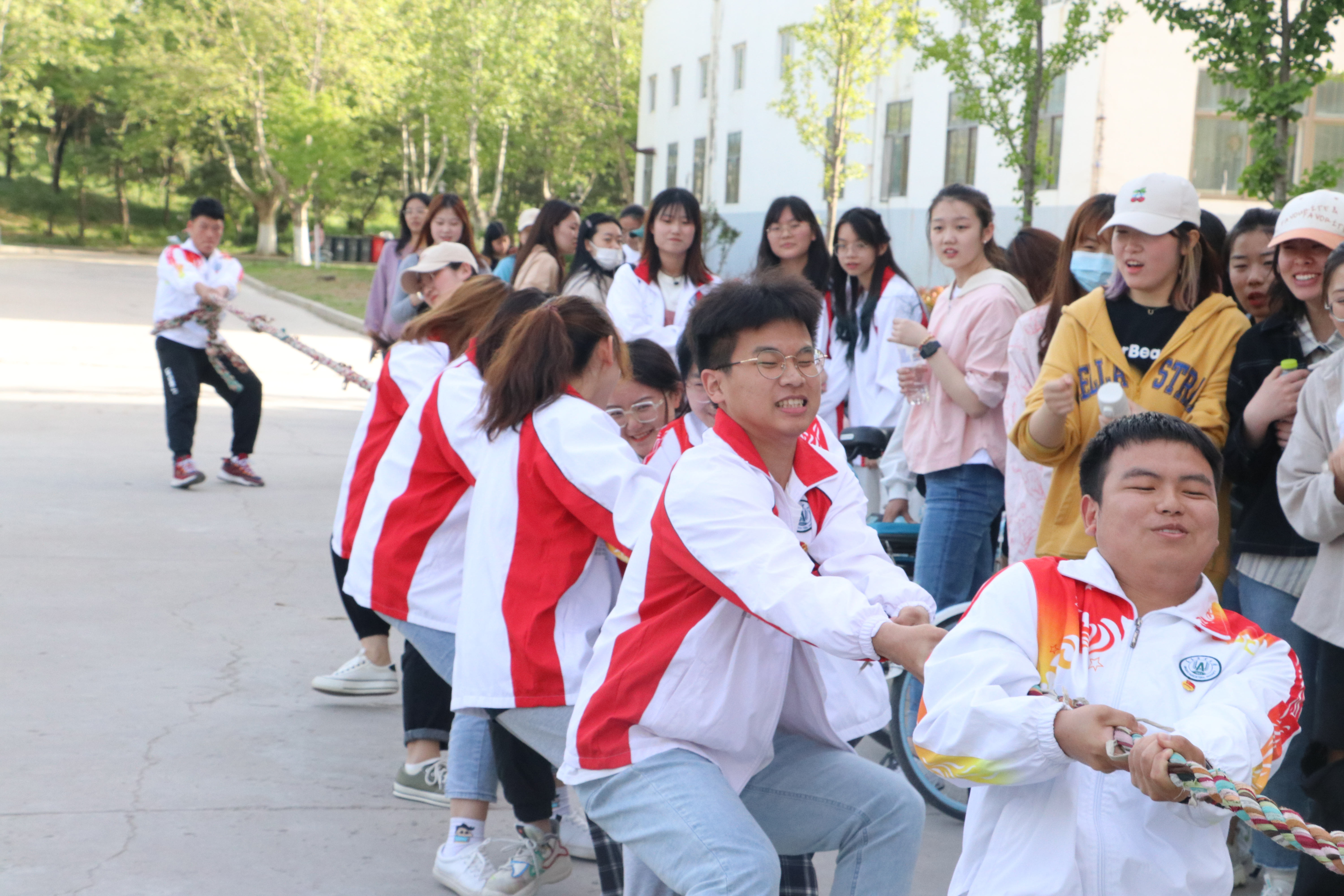 5月8日,青马班全体成员于食品楼前以拔河比赛形式举行结班仪式。青马培训小组的五个班级展开激烈的比赛。比赛采取三局两胜的赛制。比赛中,各组参赛队伍卯足了劲,喊着“一二、一二”的号子,奋力向后拉,力量拧成一股绳。队伍外的学生则在旁边呐喊助威,每个人都热情高涨。质检2002班李卓在活动中说:“团结就是力量,当我们的力气往同一处使时,就会迸发出无限的可能,拔河是这样,实现中华民族伟大复兴亦是如此。”最后,学院团委书记李永青,辅导员赵莹、江巧宁、李振荣与青马培训小组的成员们合影留念。