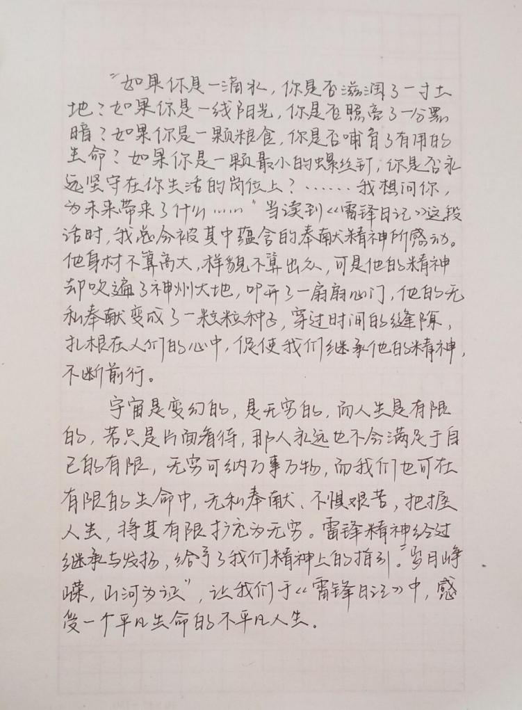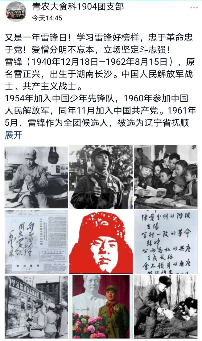 “我要把有限的生命投入到无限的为人民服务的事业中去。”时间在变,人在变,但雷锋精神却常伴食品学子左右。在学生看来,弘扬雷锋精神不仅是口号,更是在行动。各班级围绕雷锋同志生平事迹、毛泽东等老一辈革命家向雷锋同志学习的题词以及习近平总书记关于雷锋精神的重要论述述等展开线上理论学习,并通过主题团课、主题班会等形式让学生真正了解雷锋的优秀事迹,学习雷锋高尚品德,传承“奉献、友爱、互助、进步”的志愿服务精神。