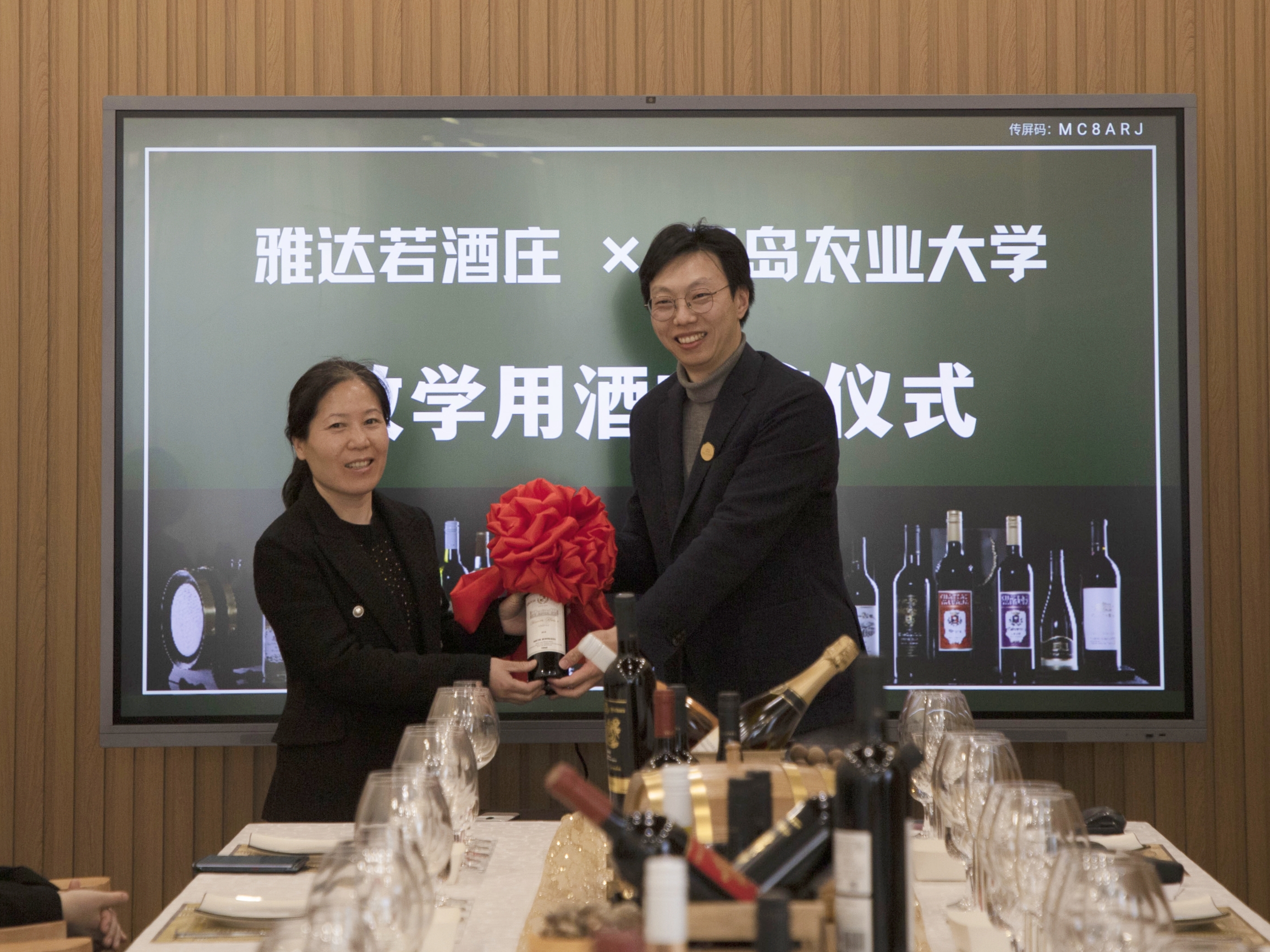 雅达若酒庄中国首席运营官杨伟克对酒庄进行了详细介绍并代表酒庄向学院捐赠了30瓶教学用酒。他表示,希望与学校达成深度战略合作,双方优势互补、资源共享,在推进产教融合的同时实现共赢。