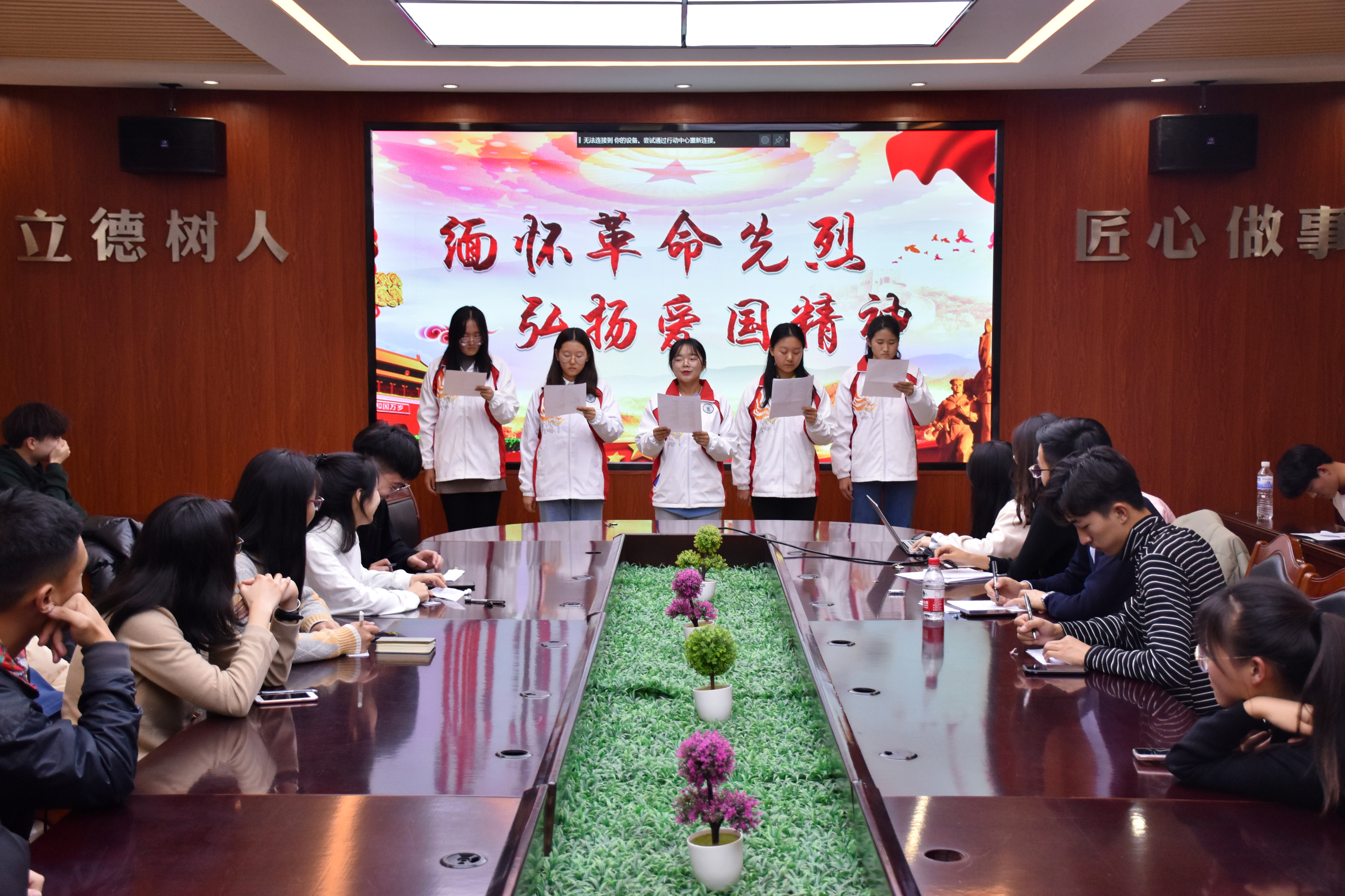 十六组选手准备充分,动作与伴奏相结合,自然大方,深情并茂,他们用舒缓激昂的语气、各具特色的作品颂出了他们每一个人对革命先辈们的敬仰。十一组葡萄1901班的峥嵘队,五人配合默契,以一篇《烈士啊,我想起了你》获得了热烈掌声,抑扬顿挫的朗诵充分展现了过去先辈们的热血与英勇,或高或低的语调真挚表达了他们心中的敬仰与热爱。十五组质检1904班的李楠与郭佳辰朗诵了他们的原创诗歌《从1919走向2019》,吐字清晰,声音洪亮,最后一句“这盛世,如你所愿”勾起了全体成员对革命先烈的思念之情。比赛中,全体起立奏唱国歌,并欣赏由学生带来的精彩歌曲表演。