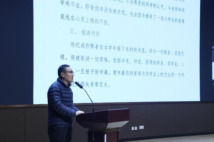 会上,李永青从考试案例警示与考试作弊成本分析两个方面为同学们详细阐释了考试作弊的弊端及其影响,并对学校关于考试的相关规定作了详细说明。会议要求各位考生要端正思想、提高认识,严肃考风考纪,严格遵守考试及考场纪律,自觉抵制不良考风,坚决杜绝违纪作弊行为,确保考试的公平。最后,李永青为全体同学加油鼓气,预祝大家在期末考试中取得良好的成绩。