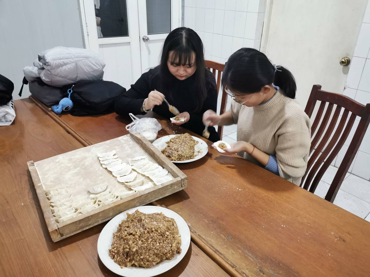 到达嘉馨敬老院后,工作人员向实践队员初步介绍了敬老院的有关情况以及老人们的生活状态。随后,实践队伍分为两个小组,一组队员帮助老人清扫卫生,与老人聊聊家常。敬老院的刘奶奶和卞奶奶热情的邀请实践队员进入房间,主动分享讲述了她们的一些经历,并勉励队员要珍惜年轻的幸福生活,好好学习,好好读书,为社会做贡献。另一组则来到敬老院厨房,为老人准备冬至的午餐水饺。实践队员与敬老院后厨工作人员齐心协力,揉面、调馅、擀面皮、包饺子,将热腾腾的水饺在午饭时间准时送至了老人房间。张爷爷吃着美味的水饺,向实践队员讲述老一辈的故事,午餐氛围温馨融洽。