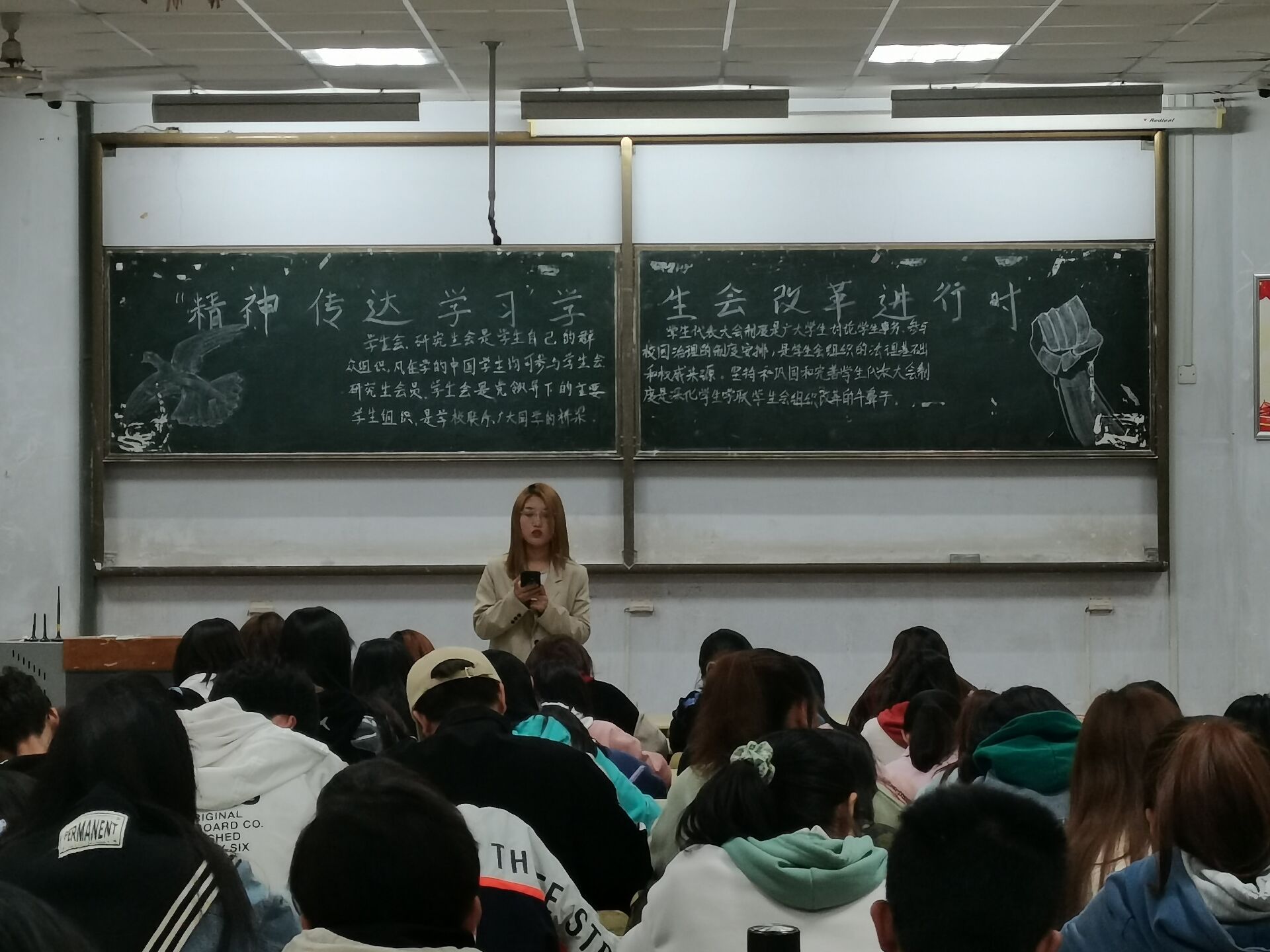 为响应国家号召,使学生会回归服务同学宗旨,找准组织定位,4月18日,tyc234cc 太阳成集团在教学区开展“精神传达:学习‘学生会改革进行时’系列评述文章”主题政治学习,2019级、2020级学生积极参加。