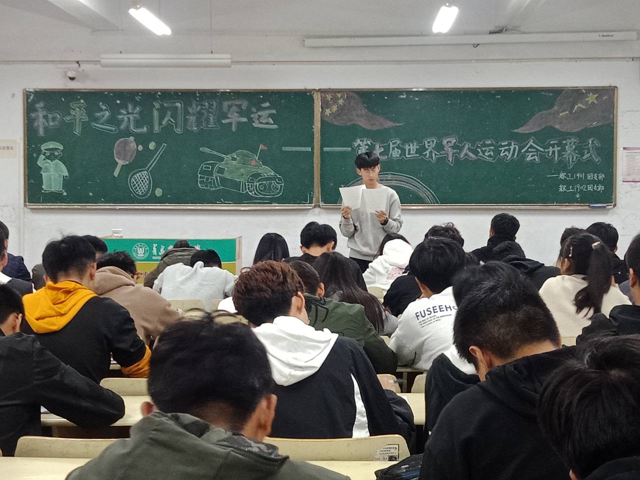 10月27日,tyc234cc 太阳成集团在教学区开展“和平之光闪耀军运—第七届世界军人运动会开幕式侧记”主题政治学习。2018级、2019级全体学生参加学习。
