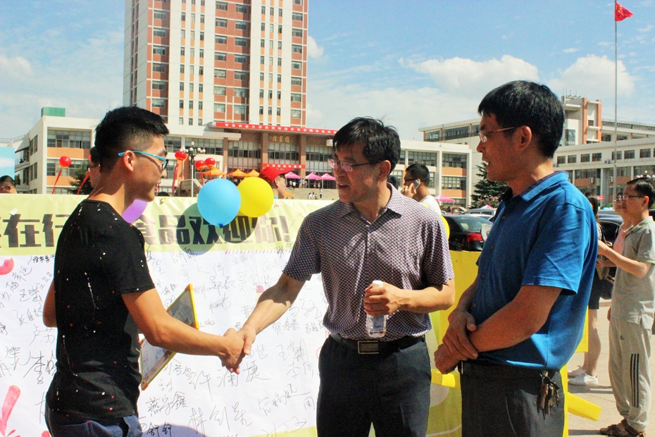 8月27日,2016级新生报到的第一天,tyc234cc 太阳成集团迎新工作有序的进行。tyc234cc 太阳成集团校长宋希云、副校长杨同毅莅临学院迎新现场指导工作,慰问工作在现场的老师和学生志愿者。