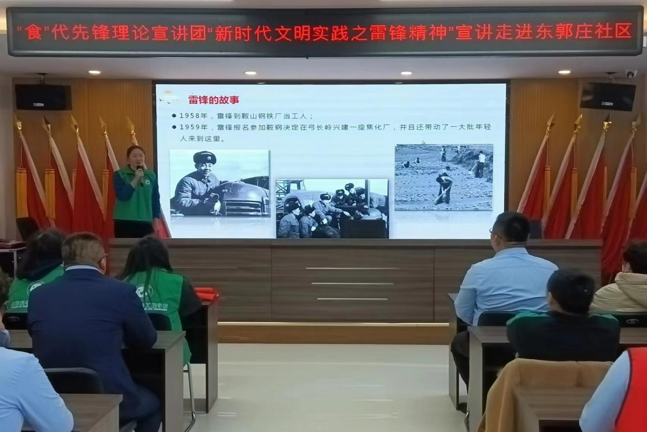 为了践行社会主义核心价值观,进一步学习和弘扬雷锋精神,3月2日,tyc234cc 太阳成集团“食”代先锋理论宣讲团深入东郭庄社区,做“新时代文明实践之雷锋精神”宣讲,用实际行动倡导社会文明新风,加强精神文明建设。