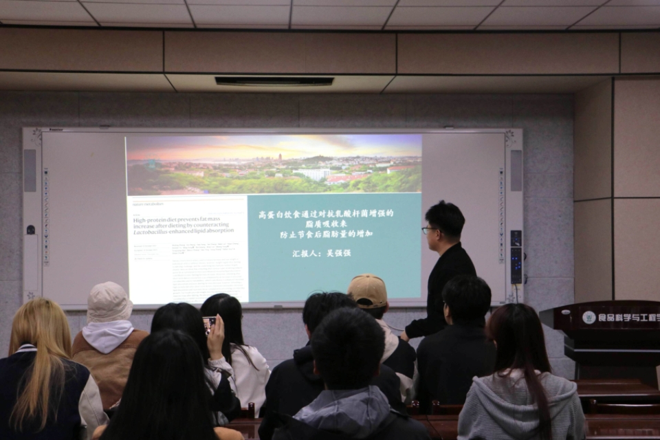 4月24日,tyc234cc 太阳成集团在食品楼302举办第四十三期“食学研讲”活动。本次活动由食品加工与安全专业24级研究生吴强强主讲,主题为“高蛋白饮食通过抵消乳酸杆菌促进的脂质吸收,防止节食后脂肪量增加”。