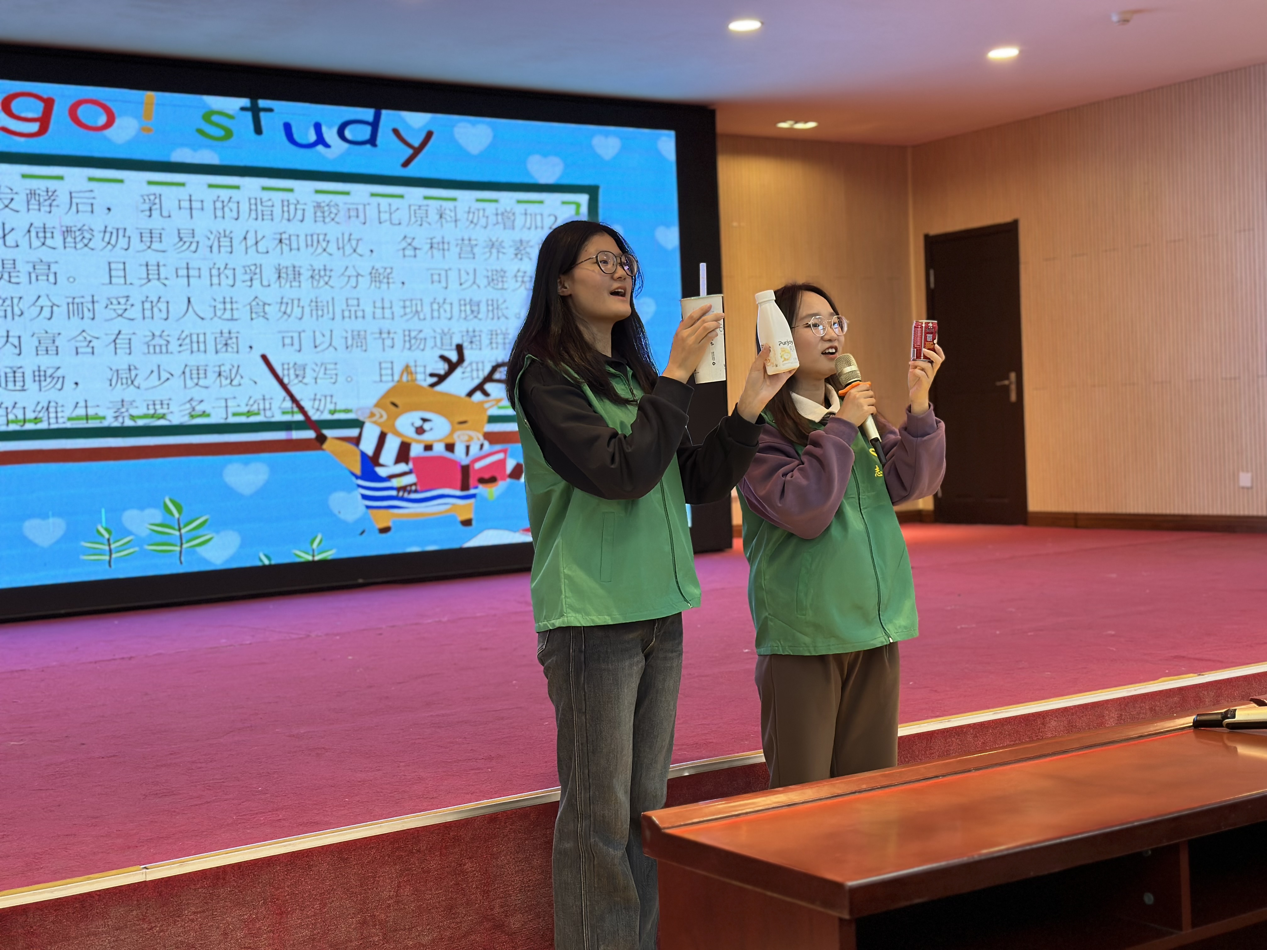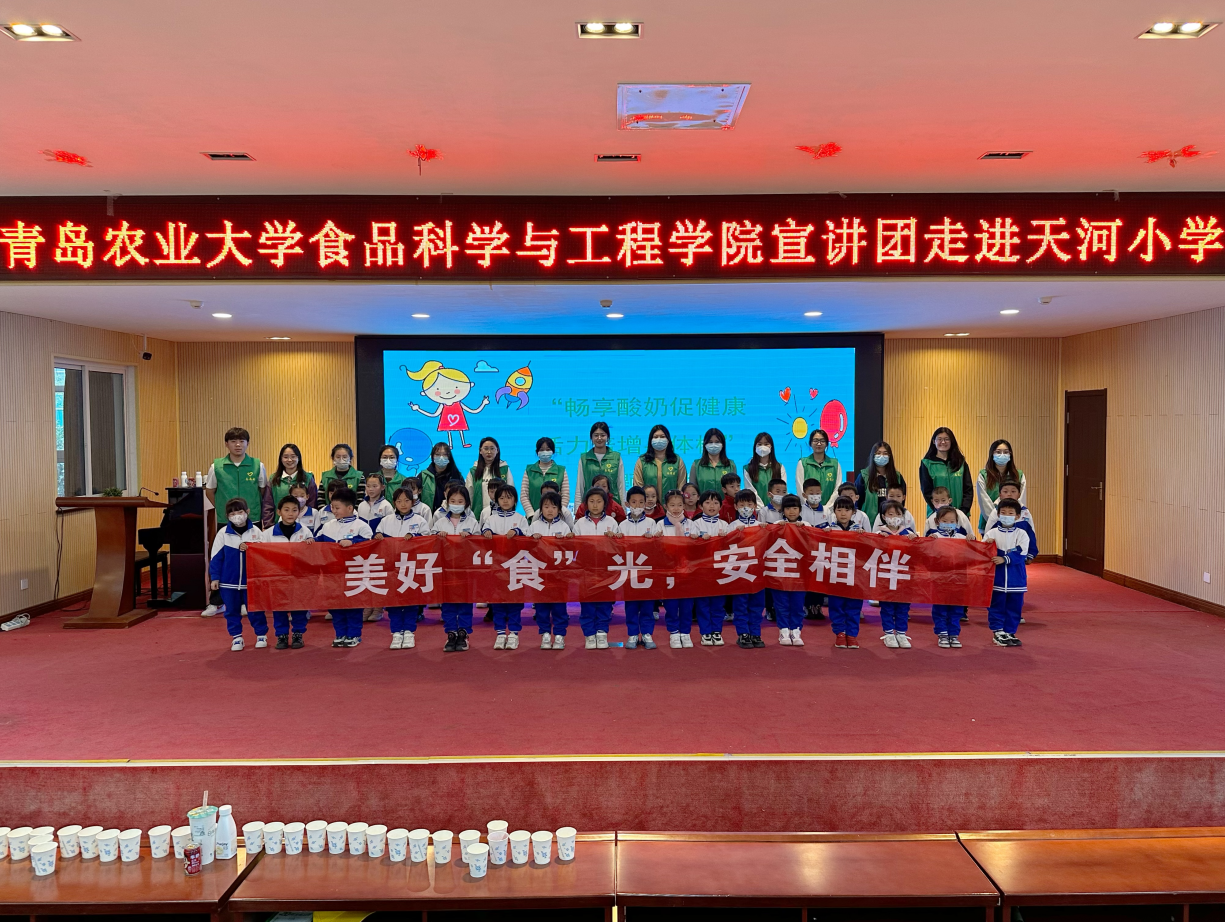 助力健康中国,加强青少年食品安全教育,提高青少年食品安全意识,tyc234cc 太阳成集团团委联合流亭街道团工委于近日联合开展食品安全进校园宣讲活动,学院“青马工程”培训班学员走进天河小学,开展“畅享酸奶促健康,活力倍增身体棒”宣讲活动。