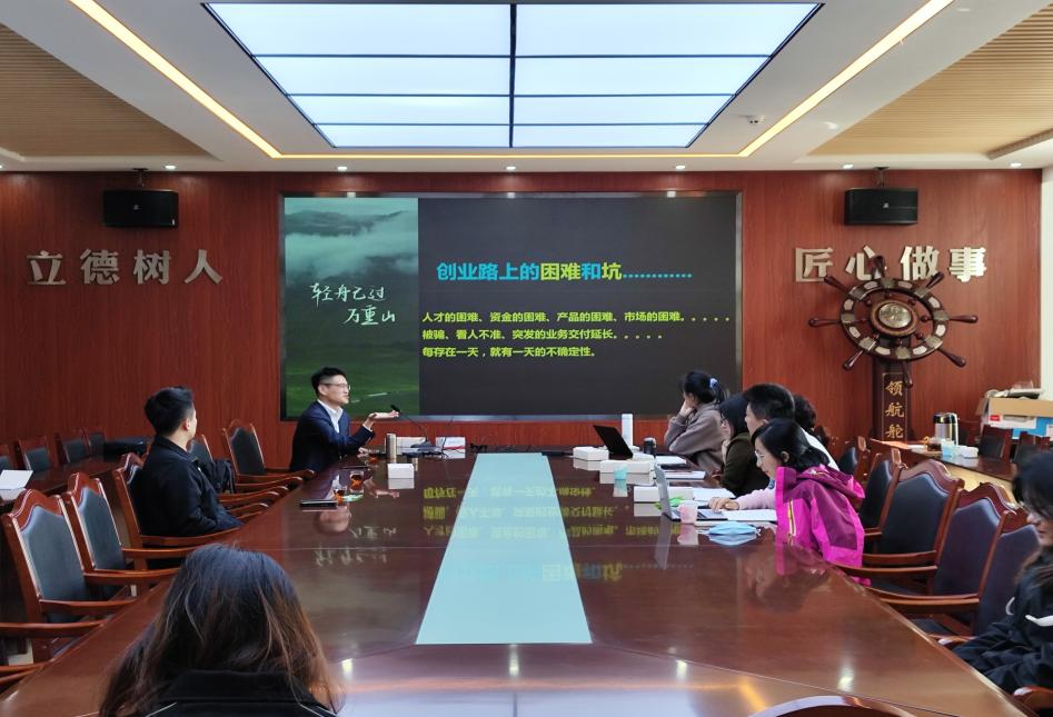 报告中,李明强从什么是创业、如何科学地创业两个方面,对创业与商业进行了不同维度的阐述,结合自身在青岛国网电力工程有限公司转型发展中的成长经历向同学们分享了经验。