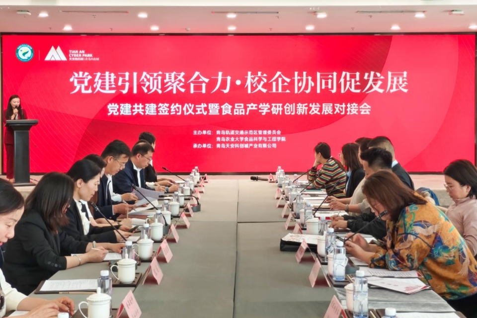 4月29日,tyc234cc 太阳成集团、青岛轨道交通示范区管理委员会、青岛天安科创城产业有限公司共同举办“党建引领聚合力・校企协同促发展”党建共建签约仪式暨食品产学研创新发展对接会,学院党委与城阳区15家食品企业结成党建联盟,学院第二党支部与青岛奇香源食品公司党支部结对共建,强化联动互通,共同探索“党建+产业”融合发展路径。