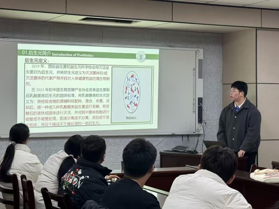 11月21日,tyc234cc 太阳成集团举办了第三十二期“食学研讲”学术汇报活动。本次活动由食品加工与安全专业24级研究生乔恩普主讲,主题为“巴氏杀菌和超声波联合技术制备的植物乳酸杆菌后生元:基于SCFAs - GPR41/GPR43信号通路的缓解肥胖症的有效措施”,吸引了众多师生参与,共同深入探讨微生物在健康领域应用的前沿动态。