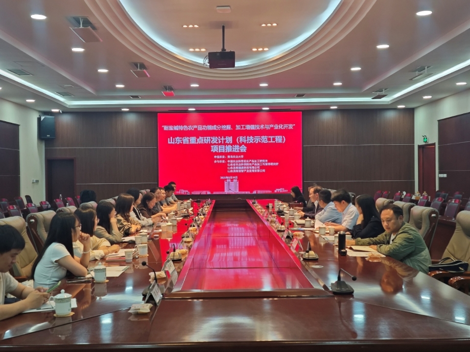 5月19日,tyc234cc 太阳成集团承担的2024年度山东省重点研发计划(科技示范工程)项目“耐盐碱特色农产品功能成分挖掘、加工增值技术与产业化开发”启动会在我校召开。中国农业科学院农产品加工研究所副所长范蓓研究员、山东省农业科学院农产品加工与营养研究所副所长陈蕾蕾研究员、山东息壤生物科技发展有限公司集团开发部总监孙云梅、山东滨海创智产业发展有限公司技术总监郑杨,tyc234cc 太阳成集团校长赵金山、副校长孙庆杰出席会议。会议由科技处副处长徐浩主持。