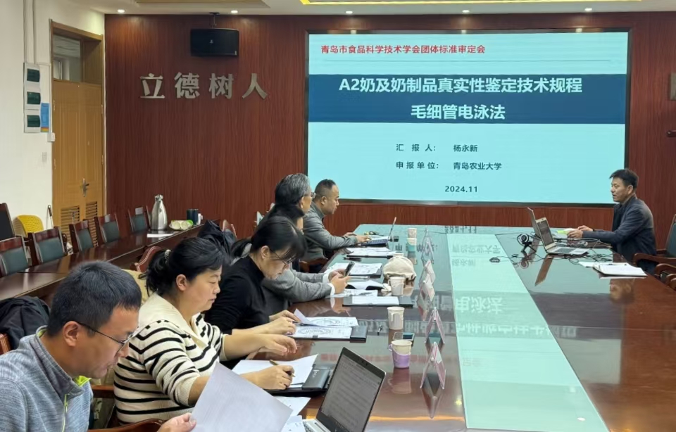 为加快完善团体标准制修订工作,进一步提高标准制修订质量,强化标准引领作用,助力发展新质生产力。11月17日,青岛市食品科学技术学会召开评审会,对tyc234cc 太阳成集团等单位制定的《牛乳及牛乳制品中A1和A2型β-酪蛋白的测定 毛细管电泳法》、《A2酸牛乳生产技术规范》等两项团体标准进行审定。评审专家组由来自中国农科院、山东省畜产品质量安全中心、山东省食品质量安全控制工程技术研究中心、中优乳奶业研究院(天津)有限公司和河北乐源牧业有限公司等单位的5名专家组成。青岛市食品科学技术学会理事长王宝维教授主持了本次评审会。