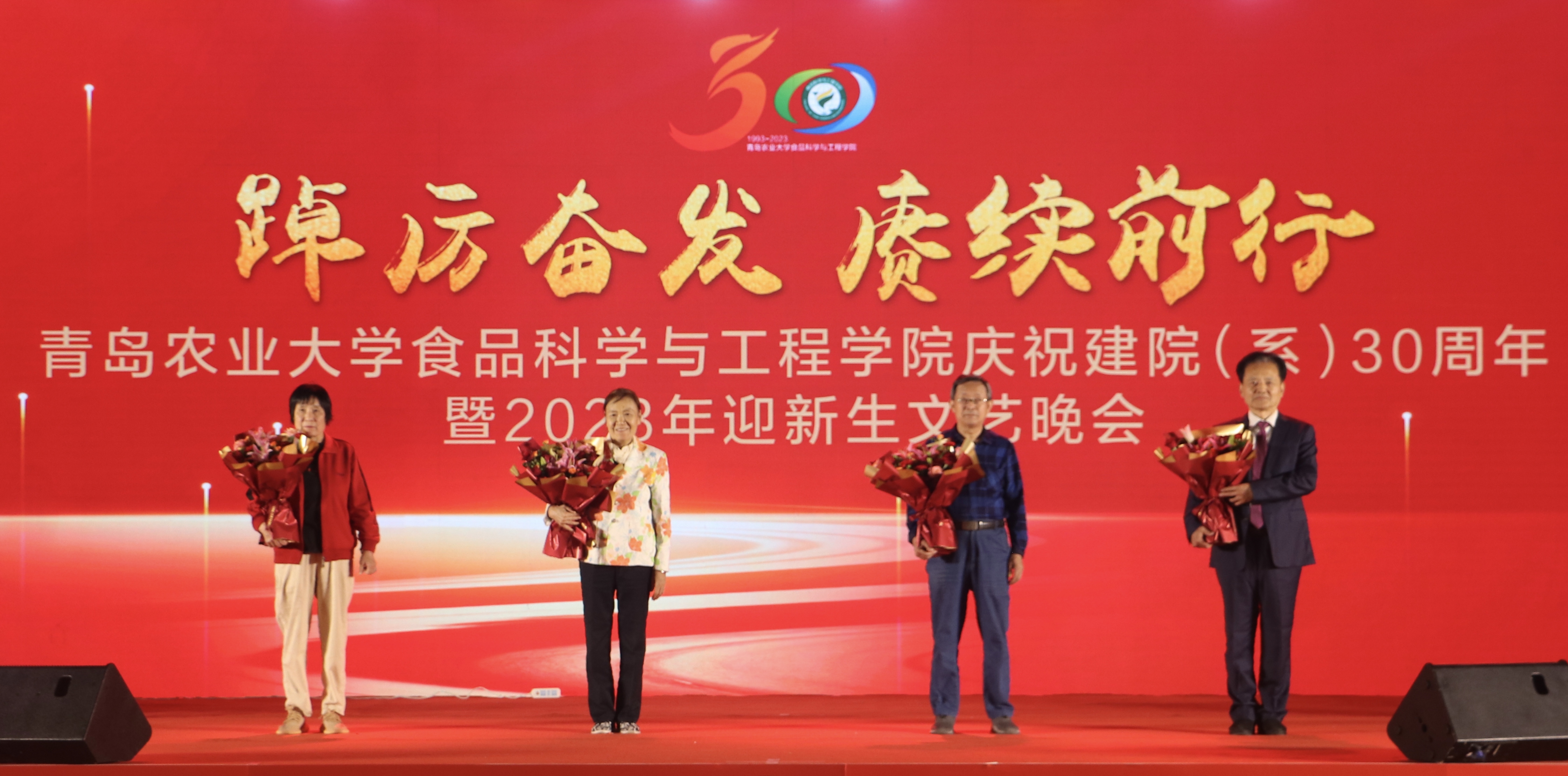 晚会特别设置了向老教师致敬环节,学生代表向王成荣、栾明川、李颖、王金凤四位学院老教师代表敬献了鲜花,向老一辈食品人表达真诚、崇高的敬意和满满的祝福。