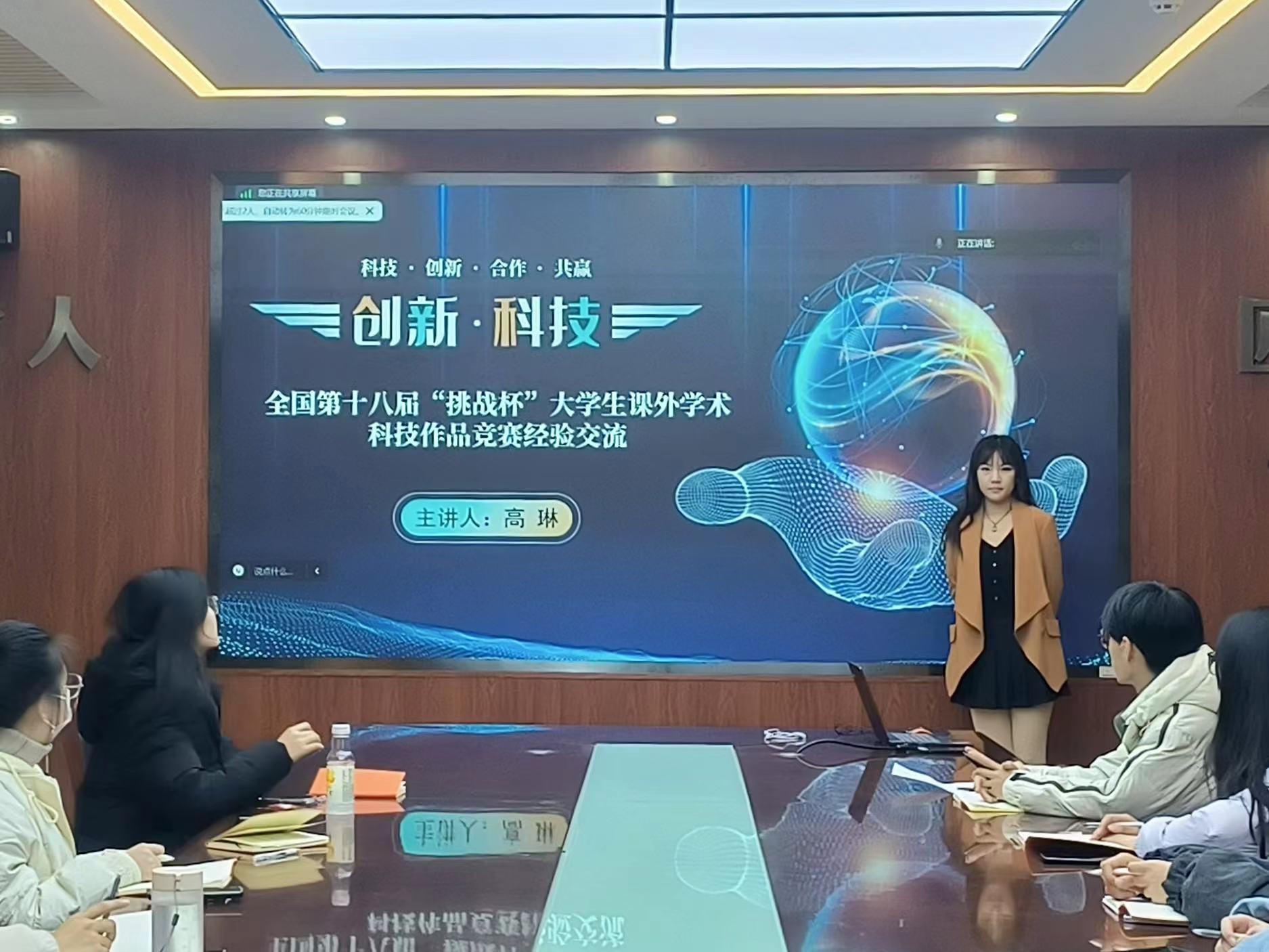高琳从赛事介绍、参赛意义、准备过程、经验分享四个方面展开了细致地经验交流;陈思颖同学以“不惧挑战 沐光而行”为主题,以比赛日程为轴,介绍了赛事的含金量、申报类型以及赛事过程中需要具备的各项能力。