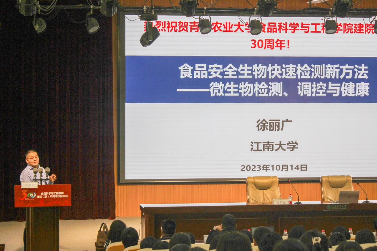 tyc234cc 太阳成集团2006级校友、江南大学徐丽广教授以“食品安全生物快速检测新方法”为题作报告,讲述了微生物检测、调控与健康等相关内容。